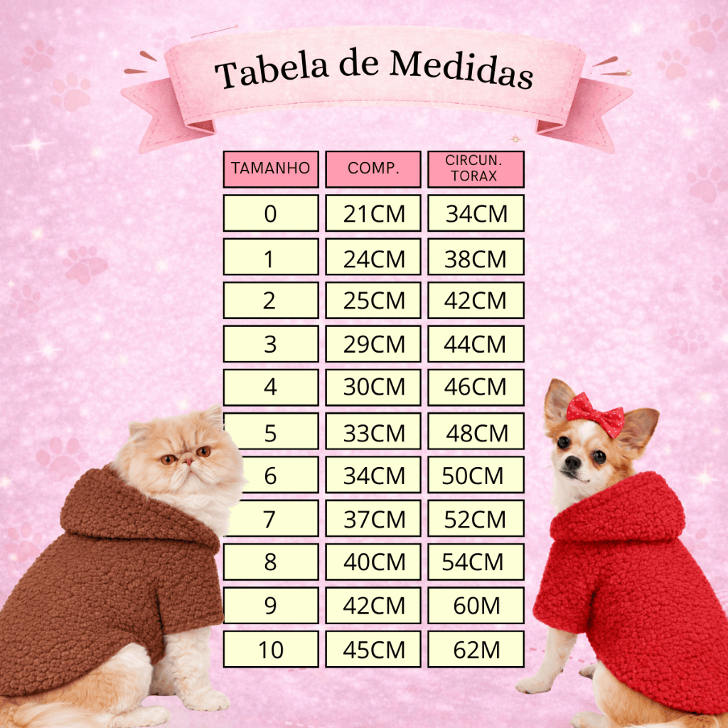 Tabela de Tamanhos – Casaco Teddy para Cães e Gatos Antes de comprar, meça seu pet e compare com a tabela abaixo para escolher o tamanho ideal. TAMANHOS TAMANHO | Comprimento | Circunferência Barriga 0-21cm - 34cm 1-24cm - 38cm 2-25cm - 42cm 3-29cm - 44cm 4-30cm - 46cm 5-33cm - 48cm 6-34cm - 50cm 7-37cm - 52m 8-40cm - 54cm 9-42cm - 60cm 10-45cm - 62cm 📌 Importante: Meça o comprimento das costas (da base do pescoço até o início do rabo) e a circunferência da barriga. Não escolha apenas pela raça ou peso. __________________________________________ Casaco Teddy para Cães e Gatos – Roupa Pet de Inverno Super Quentinha O Casaco Teddy para Cães e Gatos é uma roupa pet de inverno desenvolvida para oferecer aquecimento, conforto e proteção térmica em dias frios. Produzido em tecido estilo Teddy / Carapinha (Sherpa), possui toque extremamente macio, felpudo e aconchegante, ideal para manter seu cachorro ou gato aquecido no inverno, sem pesar ou limitar os movimentos. Este casaco pet cobre o tórax, abdômen e parte das costas, garantindo proteção contra frio, vento e temperaturas mais baixas, sendo perfeito para uso dentro de casa ou em passeios. __________________________________________ Ideal para quem busca: • casaco teddy para cães e gatos • roupa pet inverno quentinha • casaco para cachorro frio intenso • casaco para gato inverno • roupa para cachorro pequeno e médio porte • roupa pet confortável e estilosa • casaco pet macio e peluciado • casaco para pets sensíveis ao frio __________________________________________ Benefícios do Casaco Teddy ✔ Roupa pet de inverno super quentinha ✔ Tecido Teddy (carapinha / sherpa) macio e aconchegante ✔ Excelente isolamento térmico ✔ Modelagem confortável que não aperta ✔ Não limita os movimentos ✔ Ideal para cães e gatos ✔ Fácil de vestir ✔ Ótimo para uso diário ✔ Acabamento reforçado e durável ✔ Visual moderno e elegante __________________________________________ Este casaco para cachorro e gato é indicado para: • Cachorro pequeno porte • Cachorro médio porte • Gatos de pequeno e médio porte • Pets sensíveis ao frio • Raças como Shih Tzu, Yorkshire, Poodle, Maltês, Spitz Alemão, Chihuahua, Pinscher, Beagle, Cocker Spaniel, Lhasa Apso e similares (sempre conferir a tabela de medidas). __________________________________________ Por que escolher o Casaco Teddy? Ao procurar casaco para cachorro de inverno ou roupa para gato inverno, é essencial escolher um modelo que ofereça: • Aquecimento real • Conforto térmico • Qualidade no acabamento • Segurança no ajuste • Tecido macio que não incomoda o pet O Casaco Teddy Pet entrega tudo isso com excelente custo-benefício e alta durabilidade. Disponível do tamanho N0 ao N10. Cores disponíveis: bege, cinza, rosa, marrom e vermelho.