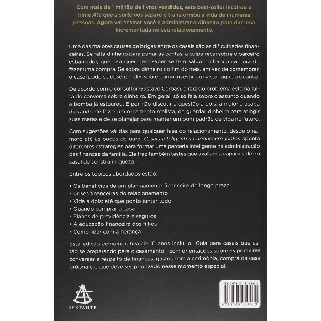 Com mais de 1 milhão de livros vendidos, este best-seller inspirou o filme Até que a sorte nos separe e transformou a vida de inúmeras pessoas. Agora vai ensinar você a administrar o dinheiro para dar uma incrementada no seu relacionamento. Uma das maiores causas de brigas entre os casais são as dificuldades financeiras. Se falta dinheiro para pagar as contas, a culpa recai sobre o parceiro esbanjador, que não quer nem saber se tem saldo no banco na hora de fazer uma compra. Se sobra dinheiro no fim do mês, em vez de comemorar, o casal pode se desentender sobre como investir ou gastar aquela quantia. De acordo com o consultor Gustavo Cerbasi, a raiz do problema está na falta de conversa sobre dinheiro. Em geral, só se fala sobre o assunto quando a bomba já estourou. E por não discutir a questão a dois, a maioria acaba deixando de fazer um orçamento realista, de guardar dinheiro para atingir suas metas e de se planejar para manter um bom padrão de vida no futuro. Com sugestões válidas para qualquer fase do relacionamento, desde o namoro até as bodas de ouro, Casais inteligentes enriquecem juntos aponta diferentes estratégias para formar uma parceria inteligente na administração das finanças da família. Ele traz também testes que avaliam a capacidade do casal de construir riqueza. Entre os tópicos abordados estão: • Os benefícios de um planejamento financeiro de longo prazo • Crises financeiras do relacionamento • Vida a dois: até que ponto juntar tudo • Quando comprar a casa • Planos de previdência e seguros • A educação financeira dos filhos • Como lidar com a herança Esta edição comemorativa de 10 anos inclui o "Guia para casais que estão se preparando para o casamento", com orientações sobre as primeiras conversas a respeito de finanças, gastos com a cerimônia, compra da casa própria e o que deve ser priorizado nesse momento especial.