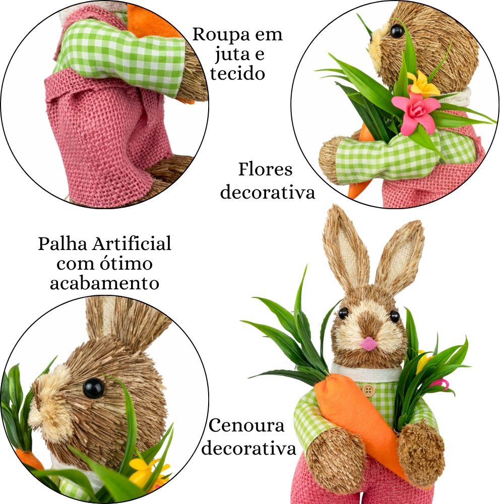 Casal De Coelhos De Páscoa De Palha Decoração P/ Casa Enfeite Linha Luxo 25cm