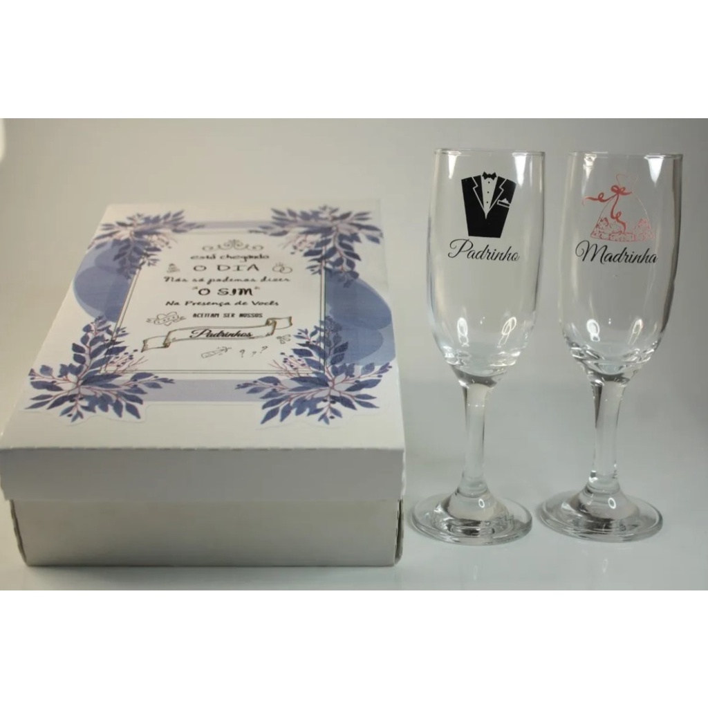 Casamento Convite Padrinhos O Sim 2 Taças Vidro Azul Flores
