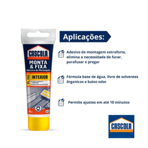 Cola Cascola Adesivo PL500 Extra Forte Monta & Fixa Interior 85gTrabalhamos com os melhores preços do mercado Livre!O adesivo de montagem Cascola Monta & Fixa PL500 Interior é ideal para aplicações na área de construção civil, decoração e reparos, eliminando a necessidade de parafusos ou pregos. Possui tecnologia à base de água (odor suave, livre de solventes orgânicos), alta resistência e permite um acabamento profissional. Sua forma de aplicação é simples, limpa, rápida e com controle de quantidade do produto.Especialmente desenvolvida para reparos internos, é extremamente eficaz na instalação de rodapés, fixação de quadros, peças decorativas, azulejos, aplicações em drywall, etc.Cascola Monta & Fixa PL 500 é uma cola de montagem de alta resistência indicada para instalações, decorações e reparos internos, sendo uma solução ideal para colagem de madeira, MDF, compensando, drywall, polestireno expandido, cerâmica, concreto, metal, pedra, vidro e cortiça.Prático de usar, Cascola Monta & Fixa PL 500 garante a eficiência na aplicação, uma vez que o produto proporciona uma excelente colagem e força final, eliminando a necessidade de furar, parafusar ou pregar.•Adesivo de montagem extraforte, elimina a necessidade de furar, parafusar e pregar•Agarre imediato•Permite ajustes em até 10 minutos•Agarre imediato•Alta força de colagem•Não escorre•Resistente•Tecnologia à base d'água (odor suave, livre de solventes orgânicos)•Tempo de ajuste de 10 minutos•Permite pintura•Uso de ambientes internos•Ótimo acabamento•Fácil e prático de usar•Uma das superfícies deve ser porosaObs.: Não adere materiais à base de Polietileno, Polipropileno, Silicone e PTFE (resina antiaderente). Não indicado para colegas de espelhosPreparação da Superfície:Necessária, pelo menos, uma superfície porosa. As superfícies devem estar firmes, niveladas e limpas, livre de poeira, graxa e umidade. Superfícies com tinta, paredes pintadas ou com tintas de más condições, recomenda-se lixar antes da aplicação do adesivo.Cor: BrancoTempo de cura total: 24h (material poroso) 48h (material não poroso)Resistência a temperatura (após cura final): -20ºC a 80ºCItens do anúncio01 Cascola PL500 Extra Forte Monta & Fixa Interior 85g
