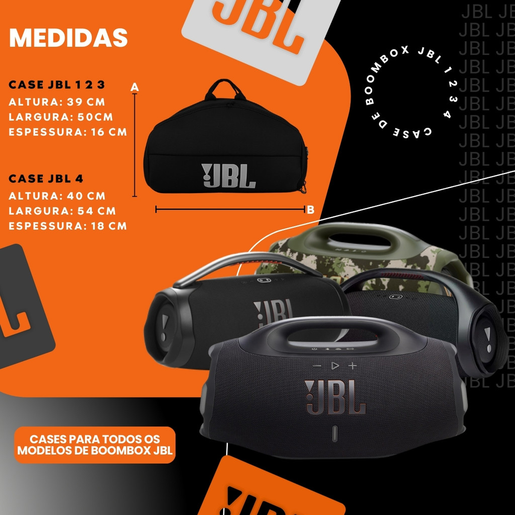 Case de Boombox 1 2 3 e o modelo novo 4 A Capa para caixa de som Boombox é ideal para quem busca segurança, praticidade e um design funcional para transportar e proteger sua caixa de som. Compatível com os modelos Boombox 1, 2, 3 e outros modelos similares, ela oferece um ajuste perfeito, garantindo máxima proteção contra impactos e respingos. Feita com material EVA soft premium reforçado com 4 mm de espessura ela proporciona uma barreira eficaz contra pequenos impactos, poeira, umidade e respingos de líquidos que podem ocorrer no dia a dia. Na parte interna ela conta com um forro de veludo acolchoado garantindo proteção extra contra arranhões e pequenos impactos. Seu design inteligente conta com um bolso externo, perfeito para armazenar cabo, carregador, celular e outros acessórios essenciais. ______________________________________________________________ Para facilitar o transporte, a capa possui duas opções de alça: - Alça de mão para um manuseio rápido e confortável. - Alça de ombro ajustável, proporcionando praticidade e conforto em deslocamentos. ______________________________________________________________ Compatibilidade: Modelos Boombox 1, Boombox 2, Boombox 3, Boombox 4 (especificado o modelo compatível) e outros modelos similares. Dimensões: CASE DA BOOMBOX 1 2 e 3 Largura: 50 cm Altura: 39 cm Espessura: 16 cm CASE DA BOOMBOX 4 Largura: 54 cm Altura: 40cm Espessura: 18 cm ______________________________________________________________ Benefícios: - Proteção eficaz contra poeira, impactos e respingos. - Transporte prático e confortável com alça de ombro ajustável e alça de mão. - Espaço extra para acessórios no bolso externo. - Design moderno e discreto, ideal para qualquer ambiente. ______________________________________________________________ Envio e Garantia: - O transporte do produto é realizado diretamente pela plataforma (site ou aplicativo). - Você pode solicitar o reembolso em até 7 dias após a compra, sem custo adicional. - Se tiver dúvidas, entre em contato. Estamos à disposição para ajudar! ----------- IMPORTANTE ----------- - Vendemos somente a capa, a caixa de som não está inclusa.