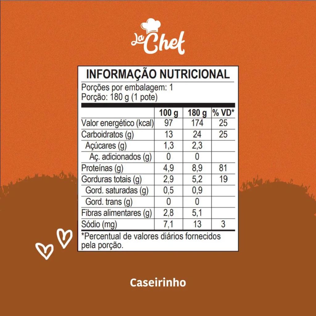 Desenvolvida a partir das receitas exclusivas da Chef e Mãe, Luana Wojciechowski, as refeições da linha La Chef fazem a junção perfeita entre qualidade, praticidade e o carinho materno. Em menos de 1 minuto ofereça com segurança uma refeição gourmet feita apenas com ingredientes naturais e orgânicos, sem sal adicionado e nenhum tipo de conservante, corante ou aromatizante. O Caseirinho possui: arroz, feijão, legumes e temperos naturais. Abóbora cabotiá orgânica, carne bovina, cebola orgânica, feijão preto orgânico, arroz integral orgânico, cenoura orgânica, azeite de oliva orgânico, alho orgânico, páprica doce, salsa, cebolinha e louro. Não contém: ovos, leite e derivados e castanhas. Pode conter: trigo e soja.