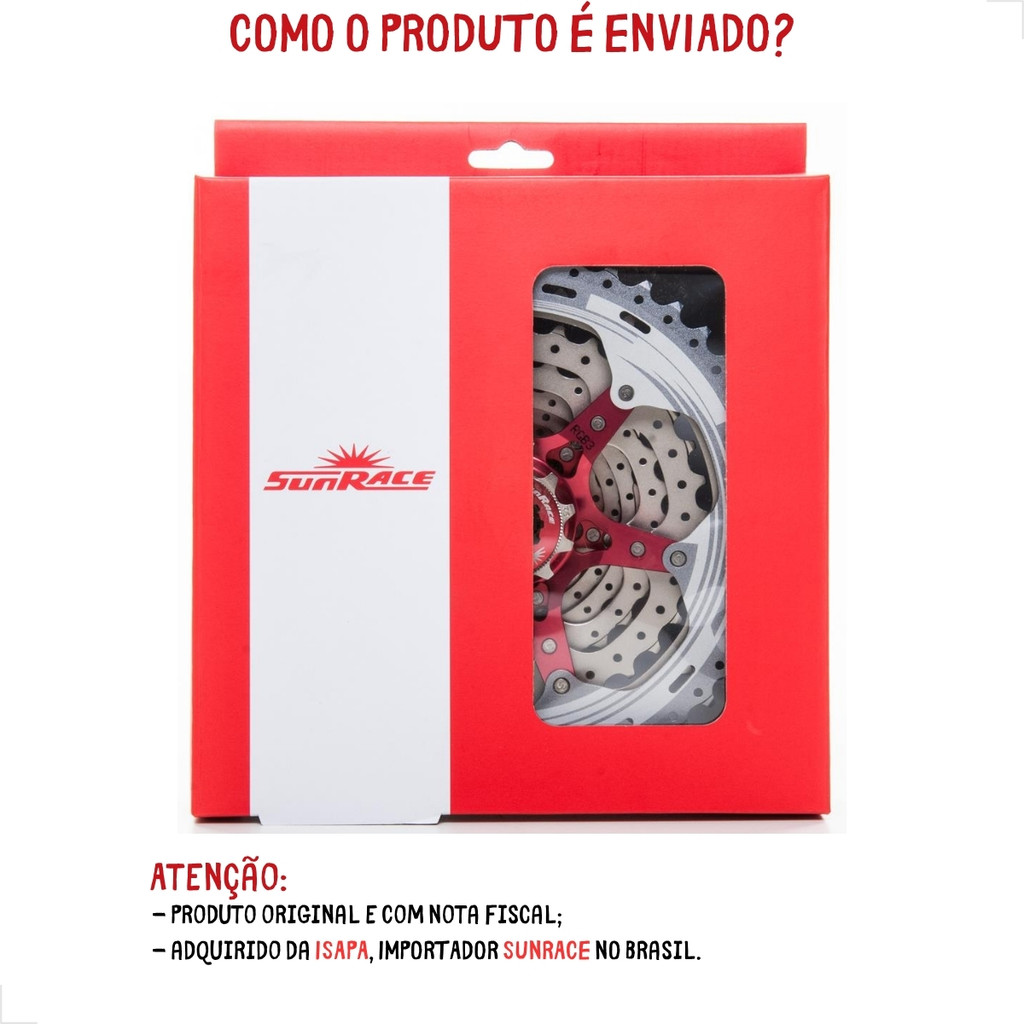 CASSETE 10V SUNRACE MX3 11/46D PRATA - MTB *** O câmbio traseiro deve ser específico para trabalhar com 46 dentes, caso contrário será necessário a instalação de prolongador no sistema. *** O cassete SUNRACE é uma ótima opção visando o Custo X Benefício para as relações de 10v de MTB. O modelo tem relação de marchas ampla, 11/46D, e é exclusivo para relação com coroa ÚNICA de 10v, 1X10V. Ele apresenta um ÓTIMO acabamento, entrega um EXCELENTE funcionamento no conjunto da relação com boa durabilidade. É construído com pinhões em AÇO e ÚLTIMO cog em ALUMÍNIO finalizado na cor PRATA. A aranha Vermelha em ALUMÍNIO. É possível instalar esse cassete em cubos com FREEHUB de 8v, 9v, 10v ou 11v (MTB). Limitações para compatibilidade: - O cubo traseiro deve ser com freehub de 8v ou mais velocidades para MTB; - Esse modelo é cassete de encaixe, não serve com cubo de rosca; - O câmbio traseiro deve ser específico para trabalhar com 46 dentes – Ex: Shimano RD-M5120 – em relação de coroa única 1X . Especificações: - Marca: SunRace; - Relação: 11/46D (11-13-15-18-21-24-28-34-40-46D); - Modalidade: MTB; - Compatível: 10 Velocidades; - Configuração Relação: 1x10v; - Material: COG – Aço e Alumínio, ARANHA – Alumínio; - Cor: PRATA e aranha VERMELHA; - Origem: Taiwan; - Peso Aproximado: 450g. Atenção: - Acompanha Embalagem Original; - Produto original SUNRACE; - Importado por ISAPA; - Garantia de 90 dias; - Acompanha nota fiscal. Aguardamos o seu pedido! INDIAN BIKE SHOP