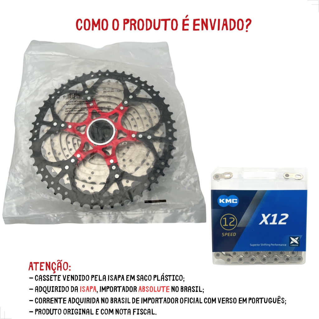 🔧 KIT CASSETE 12V ABSOLUTE 11/50D + CORRENTE KMC X12 PRATA 126 ELOS – MTB Este kit foi desenvolvido para quem deseja montar ou atualizar sua relação 12V com excelente custo-benefício, durabilidade e precisão nas trocas. A combinação Cassete Absolute 11/50D + Corrente KMC X12 oferece compatibilidade ampla, funcionamento suave e resistência até nos treinos mais intensos. 📦 ITENS INCLUSOS • 01 Cassete Absolute 12V 11–50D (Versão OEM – sem caixa) • 01 Corrente KMC X12 Silver/Prata – 126 elos + MissingLink ⚙️ SOBRE O CASSETE ABSOLUTE 12V 11/50D Modelo com excelente custo-benefício, construção reforçada e compatível com FREEHUB padrão Shimano HG (8v / 9v / 10v / 11v MTB). Aranha em alumínio vermelha Pinhões em aço de alta resistência Cogs prata com último cog preto Relação ampla 11–50D para subidas exigentes Especificações do Cassete Marca: Absolute Linha: 12V Modelo: 11/50D Modalidade: MTB Compatível com coroa única (1x12) Relação: 11-13-15-17-19-21-24-28-32-36-42-50D Material: Aço (cogs) + Alumínio (aranha) Peso aproximado: 620g Padrão freehub: Shimano HG ⚙️ SOBRE A CORRENTE KMC X12 – PRATA Tecnologia avançada X-Bridge, trocas rápidas e silenciosas, totalmente compatível com SRAM Eagle, Shimano 12v e demais sistemas. Especificações da Corrente Marca: KMC Modelo: X12 Cor: Prata Elos: 126 Não direcional Emenda: MissingLink (inclusa) Material: Aço Peso aproximado: 280g Part Number: BX12NP126 ⚠️ ATENÇÃO • O câmbio traseiro deve ser compatível com cog de 50 dentes • Utilizar sempre corrente e coroa específicas para 12 velocidades • Cassete versão OEM (vendido pela ISAPA em embalagem plástica) 🧾 GARANTIA E PROCEDÊNCIA • Cassete original Absolute – importação oficial ISAPA • Corrente KMC com embalagem original lacrada • Envio imediato + Nota fiscal