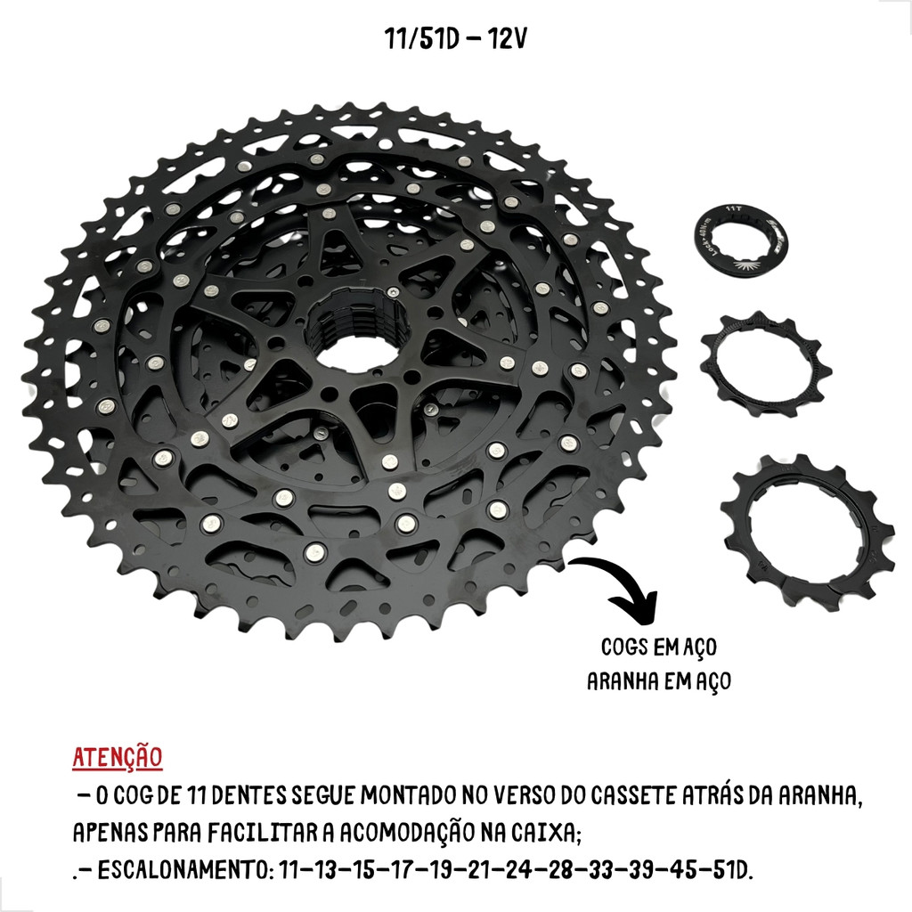 | CASSETE 12V SUNRACE MZ600 11/51D K7 PADRÃO HG PRETO MTB 1X12V SERVE... este produto | R$ 427,99 | 20% | 4.9/5 | — |