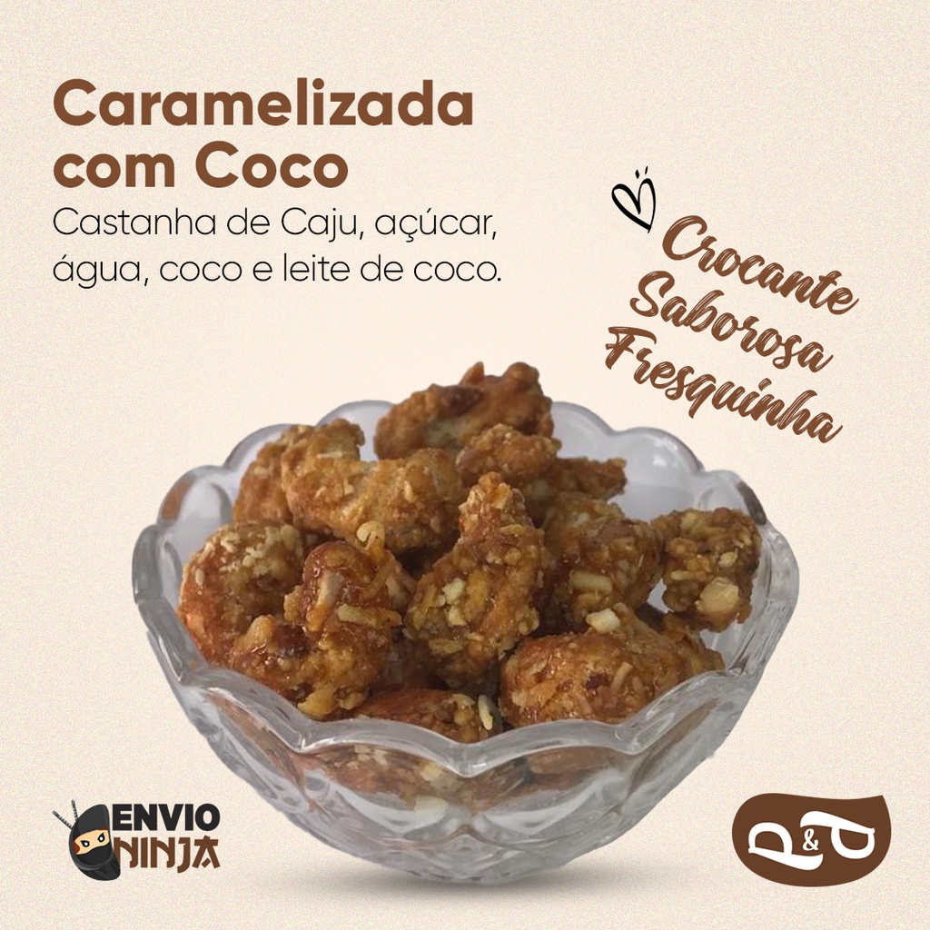 Castanha de Caju Caramelizado com Coco – Sabor Tropical e Crocância A Castanha de Caju Caramelizado com Coco une a textura crocante da castanha com a doçura do caramelo e o toque especial do coco, resultando em um snack delicioso e diferente. Ideal para quem busca uma combinação saborosa e prática. ** Benefícios: - Combinação de castanha crocante, caramelo e coco - Sabor doce com toque tropical - Prático para consumo como snack - Produto saboroso e de qualidade - Perfeito para momentos de prazer ** Ficha Técnica: - Produto: Castanha de Caju Caramelizado com Coco - Ingredientes: Castanha de caju, caramelo, coco ralado - Indicação: Consumo como snack - Enviado com ampla validade *Imagem ilustrativa. O produto pode apresentar variações de cor, sabor e aparência, conforme as características naturais das matérias-primas e diferenças entre as safras do ano.