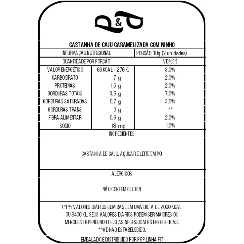 Castanha de Caju Caramelizada com Ninho Uma explosão de sabor em cada mordida! A Castanha de Caju Caramelizada com Ninho da P&P combina a crocância da castanha premium com o toque doce do caramelo e o sabor inconfundível do leite em pó. Um snack irresistível para quem ama um docinho na medida certa – perfeito para presentear ou saborear em qualquer momento do dia. ℹ Benefícios: ✅ Combinação exclusiva de castanha de caju, caramelo e leite em pó ✅ Crocante, doce na medida e super saborosa ✅ Perfeita para lanches, sobremesas ou presentes ✅ Produto feito com ingredientes selecionados ✅ Sem conservantes artificiais . ℹ Modo de Uso: Pronto para consumo. Ideal para servir como snack, petisco ou sobremesa. ℹ Forma de Armazenamento: Manter em local seco, fresco e protegido da luz. Após aberto, consumir em até 10 dias ou manter bem fechado em pote hermético.