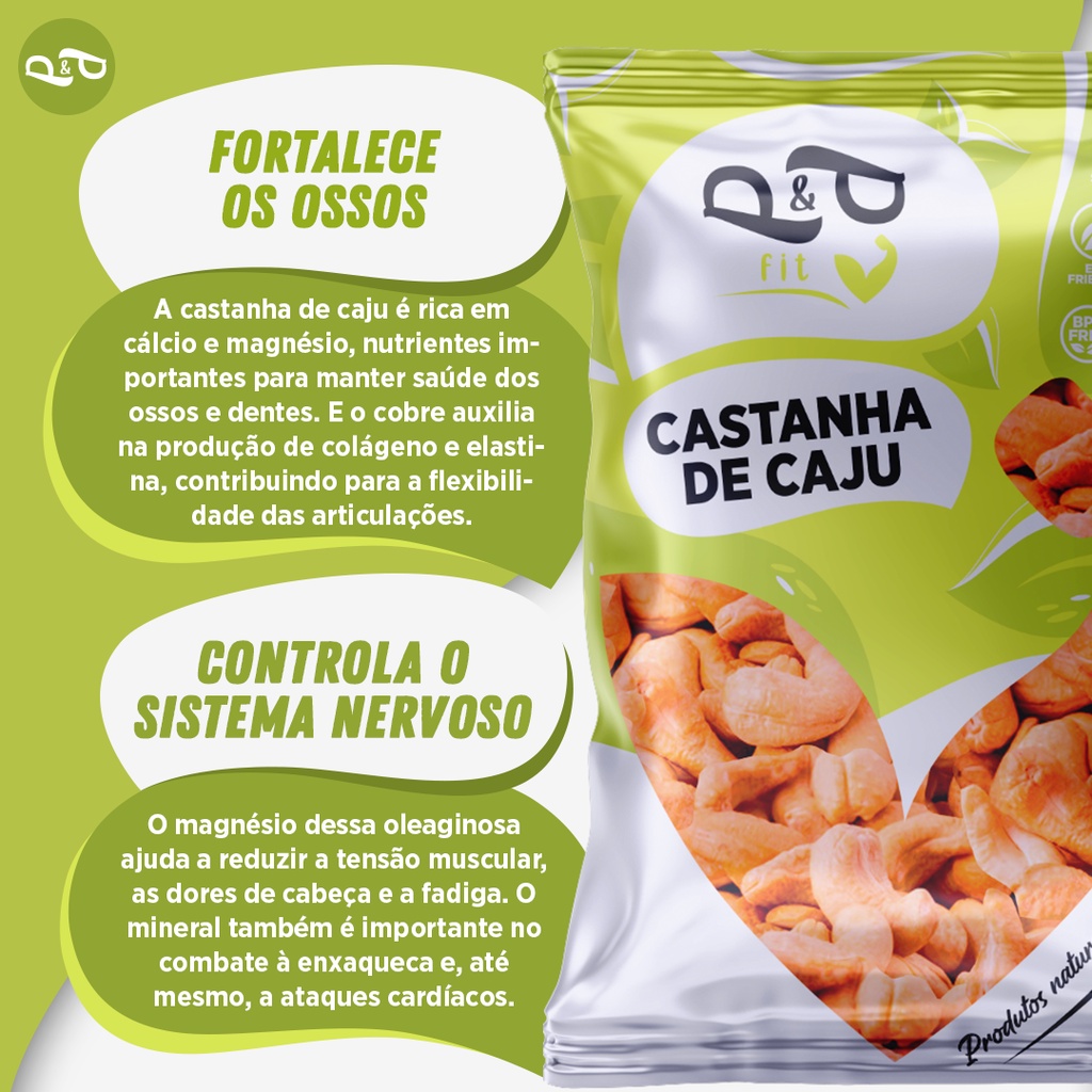 Deliciosas Castanhas de Caju Torradas W1! Inteiras e sem marcas escuras ou brocadas. Embaladas a vácuo nas opções com ou sem sal de 500g e 1kg conservando o sabor e crocância! Para suas festas de fim de ano ou para sua dieta, a Castanha de caju vai bem em qualquer momento! A castanha de caju da P&P é um produto de altíssima qualidade que superam as expectativas de nossos consumidores. Adquira um dos produtos mais recomendados por nutricionistas para se ter uma vida saudável. Compre agora e não perca essa oportunidade! A P&P Linha Fit é uma empresa especializada em produtos naturais, saiba mais sobre a gente clicando aqui. Nossas castanhas são: SAFRA NOVA EMBALADAS A VÁCUO PARA MELHOR MANUTENÇÃO DA QUALIDADE P&P Fit, seu parceiro para uma rotina saudável! O que é a Castanha do Caju? A castanha de caju não pode faltar em uma alimentação saudável. Vem lá do Nordeste e faz sucesso nas terras mineiras, paulistas e em outras regiões do Brasil! Ela encaixa tão bem com o clima tropical, que faz parte da cultura de outros países como Índia e Nigéria. É um fruto originário do cajueiro com diversas propriedades benéficas para nosso o corpo. O fruto pode ser pequeno, mas carrega uma grande quantidade de nutrientes como minerais (magnésio, ferro, potássio, selênio, cobre e zinco), vitaminas (A, D, K, PP, E) e antioxidantes. Para dietas: Vegana | Orgânica | Sem Lactose | Sem Glutén | Paleo DÚVIDAS DE SEMPRE: 1) Em quando tempo meu pedido será enviado? ENVIAMOS O SEU PRODUTO EM ATÉ 24 HORAS APÓS A APROVAÇÃO DO PAGAMENTO. SE O PAGAMENTO FOR CARTÃO É MAIS RAPIDO. SE FOR BOLETO, AS VEZES DEMORA ATÉ 48HS, PARA OCORRER A IDENTIFICAÇÃO. 2) E se meu produto não chegar? TODOS OS PACOTES SEGUEM COM O PROTOCOLO DE RASTREIO, E VOCÊ PODE CONSULTAR DIARIAMENTE NO SITE DOS CORREIOS, PARA VER ONDE ELE ESTA. CASO OCORRA ALGUM SINISTRO, A MERCADORIA ESTÁ ASSEGURADA PELO SISTEMA SHOPEE, E VOCE RECEBE SEU DINHEIRO DE VOLTA. 3) Tem o produto disponível? SIM, TODOS OS PRODUTOS ANUNCIADOS ESTÃO DISPONIVEIS PARA COMPRA. 4) Qual a validade? VOCÊ IRÁ ENCONTRAR A VALIDADE ASSIM COMO O NÚMERO DO LOTE NA PARTE SUPERIOR DA EMBALAGEM. TRABALHAMOS APENAS COM PRODUTOS FRESCOS, DESSA FORMA VOCÊ RECEBERÁ O PRODUTO COM UMA VALIDADE EXTENSA. DEPENDENDO DO PRODUTO, DE ATÉ 2 ANOS. 4) Meu pacote chegou sem vácuo? NOSSOS PRODUTOS SÃO TODOS EMBALADOS A VÁCUO, TRABALHAMOS COM A MELHOR EMBALAGEM DO MERCADO, PRÓPRIA PARA O EMPACOTAMENTO DESSE TIPO DE ALIMENTO, PORÉM PODE OCORRER EM ALGUNS RAROS CASOS DO PACOTE PERDER O VÁCUO NO CAMINHO ATÉ A SUA RESIDÊNCIA, DEVIDO A FRICÇÃO ENTRE AS PARTES PONTE AGUNDAS DO PRODUTO DURANTE O CAMINHO. NÃO SE PREOCUPE! PELO FATO DE TRABALHARMOS COM A PRODUÇÃO SEMALMENTE, O PRODUTO SEMPRE CHEGARÁ NA SUA CASA FRESCO E COM QUALIDADE INTACTA. Ficou com alguma dúvida? Entre em contato com a gente!