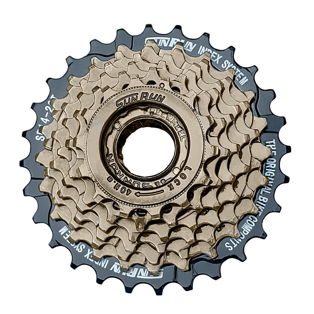 A Catraca Roda Livre 7 Marchas 14/28 Index Sunrun Ultima Preta é perfeita para os amantes de mountain bike. Com sua cor dourado-escuro, ela traz um toque de estilo para sua bicicleta. Feita em aço resistente, garante durabilidade e desempenho. Com um mecanismo de transmissão de catraca, você pode alternar entre as 7 marchas com facilidade. Com uma quantidade máxima de dentes de 28 e mínima de 14, você terá opções para enfrentar diferentes terrenos. Fácil de montar com seu sistema de rosca. Aproveite essa oportunidade de melhorar sua experiência de pedalada com a Catraca Roda Livre 7 Marchas 14/28 Index Sunrun Ultima Preta. Marca: Sunrun OU Paco (Mesma importadora) Catraca Indexada para relações de 7 velocidades, fixação com rosca Compatível com Shimano, Sunrace, Gta, Paco, entre outros... Material: Aço carbono Escalonamento: 14/16/18/20/22/24/28 Peso: 460g CORRENTE TEC 7V Marca: Tec Modelo: C30 Corrente para Bicicleta em aço Compatível com 21 marchas Medida: 1/2 X 3/32 polegadas 116 elos Composição: Aço
