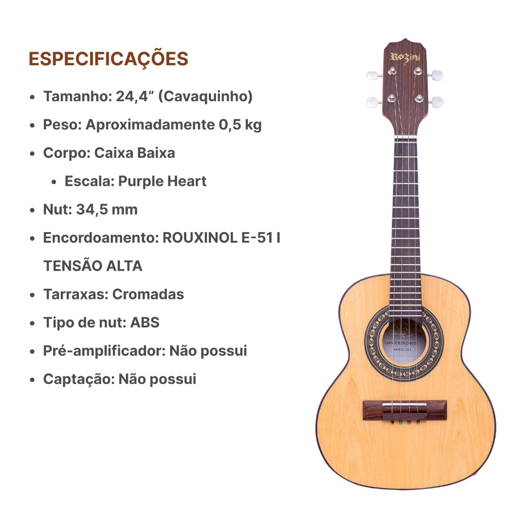 Somos a Eletromusic Loja Especializada em Instrumentos Musicais a mais de 10 anos no Mercado. Qual e o nosso diferencial? A musica corre em nossas veias e por isso amamos o que fazemos, Buscamos sempre oferecer qualidade pelo Melhor preco. Todos os nossos produtos sao de Fornecedores Nacionais com rigoroso controle de qualidade, possuem nota fiscal eletronica e garantia de fabrica. Voce e bem vindo para fazer parte da nossa historia ACOMPANHA: -01 CAPA REFORCADA EM NYLON 600 -01 AFINADOR -03 PALETAS Marca: Rozini Modelo: RC09 Cor: Imbuia (Fosco) Part Number: RC09.AC.F.I Visao Geral Entre no mundo da musica com o Cavaco Acustico Rozini RC09.AC.F.I O instrumento perfeito para quem esta comecando! Voce sempre quis aprender a tocar um instrumento e se expressar atraves da musica? O Cavaco Acustico Rozini RC09.AC.F.I e a escolha ideal para voce que esta comecando nessa jornada musical. Com seu corpo em imbuia de caixa baixa, braco em cedro e tampo em marfim, o RC09.AC.F.I oferece um som brilhante e envolvente, que vai inspirar voce a tocar cada vez melhor. Alem disso, sua escala com 20 trastes em cromo niquel e madeira purple heart (tambem conhecida como roxinho) garante um toque suave e confortavel, para que voce possa se dedicar a pratica sem cansar as maos. O corpo em imbuia de caixa baixa proporciona mais conforto, mantendo uma sonoridade encorpada e marcante, ideal para estilos musicais como o samba, chorinho e MPB, por exemplo. Com o Cavaco Acustico Rozini RC09.AC.F.I, voce tera um instrumento de qualidade, durabilidade e elegancia, tudo em um so pacote. Ideal para quem esta iniciando na musica, e um instrumento que vai acompanha-lo em sua evolucao e crescimento musical. Adquira agora o seu e comece a transformar seus sonhos em realidade. Aproveite nossas condicoes especiais de venda e de o primeiro passo nessa jornada musical. Com o Cavaco Acustico Rozini RC09.AC.F.I, voce tem tudo para se tornar um grande musico! Sobre a Rozini A Rozini e uma empresa 100% brasileira criada em meados da decada de 90, por Jose Roberto Rozini com seu grande tino comercial, acompanhado de Jose Pereira, experiente Luthier, aposentado depois de 30 anos de trabalho. Marca nacionalmente reconhecida, produz artesanalmente Violoes, Violas Caipira, Cavacos, Banjos, Baixoloes, Bandolins e a exclusiva Tanajura. Tambem exporta para diversos paises da Europa, Asia e Americas. Em 2023, a Rozini completara 28 anos de mercado e desde 2006 e o lider de mercado e o maior fabricante brasileiro de Cavacos, Banjos, Bandolins e Violas Caipiras e desde o inicio, produzindo de forma artesanal por um time de luthiers apaixonados em fazer sempre o melhor instrumento, com a alma e essencia genuinamente brasileiras! Especificacoes CORDAS: D'ADDARIO J93 COR: NATURAL ACABAMENTO: FOSCO TAMPO: LAMINADO MADEIRA: MARFIM MOSAICO: ADESIVO LATERAL E FUNDO: LAMINADO MADEIRA: IMBUIA BORDO: NAO BRACO: CEDRO TENSOR: NAO ESCALA: PURPLE HEART TRASTE: CROMO NIQUEL CAPTACAO: ACUSTICO MEDIDAS // COMP. TOTAL: 620MM PESTANA: 30MM LARGURA DA CAIXA: 65MM TARRAXA MODELO: CROMADA PINO FOLK COD#: RA427NPK Garantia A Garantia tecnica do produto RC09 da marca Rozini possui prazo de 6 meses (180 dias) prestada diretamente pelo fabricante Rozini do Brasil.