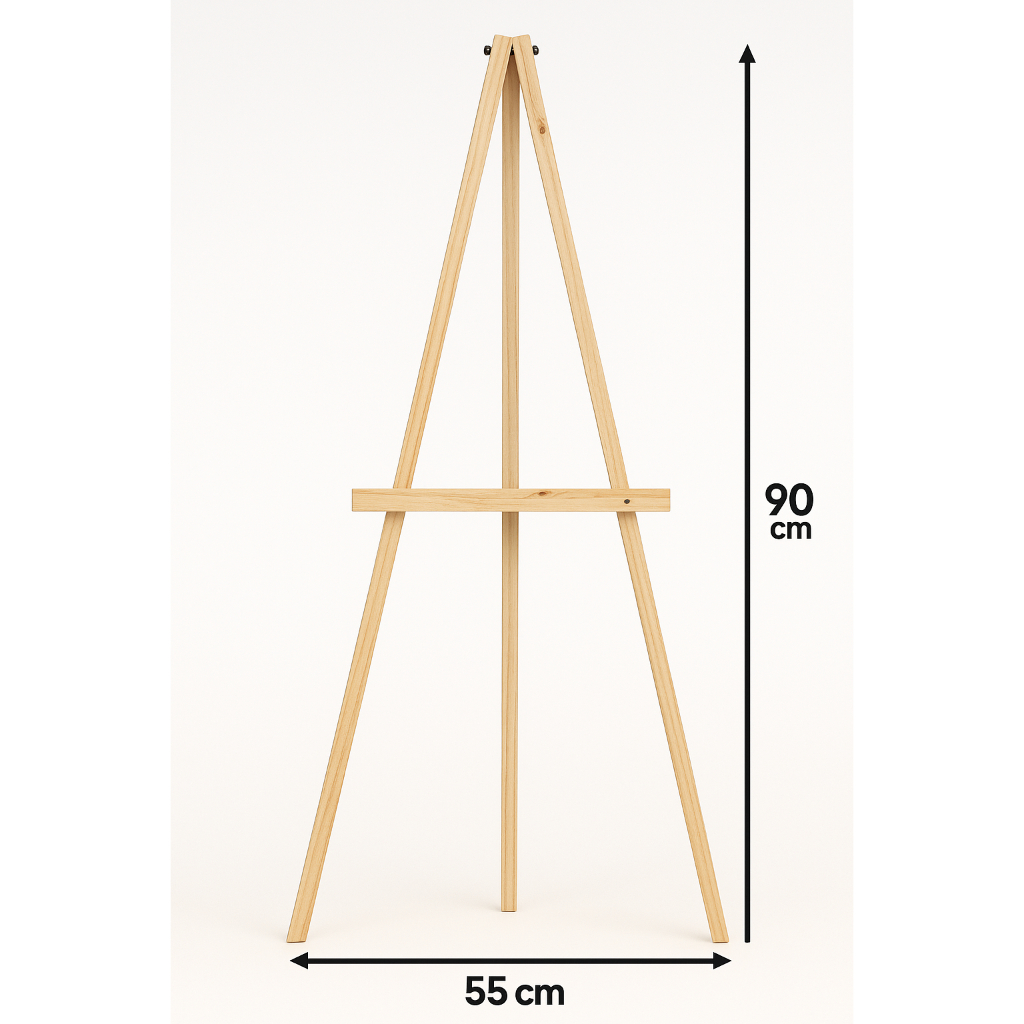 Cavalete de madeira em formato tripé, fabricado em pinus natural, ideal para apoiar telas, quadros, cartazes e painéis em apresentações, eventos ou ambientes decorativos. Possui estrutura resistente e estável, com acabamento liso e natural que valoriza o visual do produto. Medidas: Altura total: 90 cm Largura da base: 55 cm Prático, leve e funcional, é uma excelente opção tanto para uso profissional quanto doméstico.