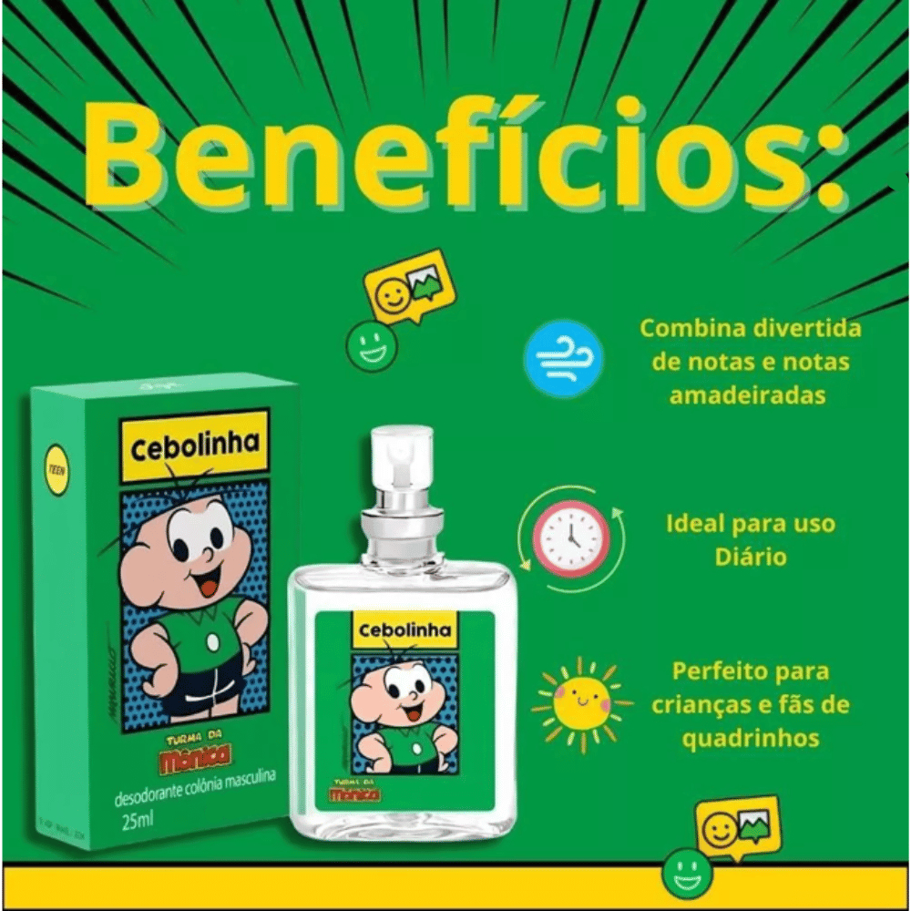 ✨ O cheirinho de aventura que todo pequeno campeão merece! ✨ Você vai se apaixonar pela Colônia Masculina do Cebolinha! Perfeita para usar depois do banho ou para levar na mochila da escola e garantir refrescância o dia todo. ✅ Por que ele é incrível? Fragrância Suave: Desenvolvida especialmente para a pele jovem, trazendo frescor sem agredir. Tamanho Pocket (25ml): Super prático! Cabe em qualquer lugar, ideal para viagens e passeios. Personagem Favorito: Com o Cebolinha, a hora de se arrumar vira uma grande brincadeira. 👇 Especificações: Volume: 25ml Marca: Cebolinha (Linha Turma da Mônica) Tipo: Desodorante Colônia com Spray 📦 O que você recebe: 1x Colônia Cebolinha 25ml (NÃO CONTEM CAIXA)