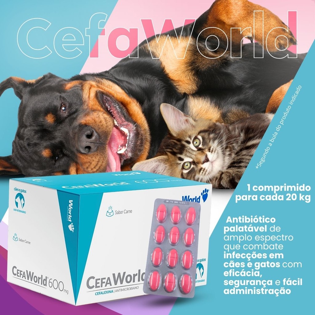 CEFAWORLD 600MG – Blister com 12 Comprimidos O CEFAWORLD 600MG é um antibiótico veterinário à base de cefalexina, indicado para cães e gatos no tratamento de infecções causadas por microrganismos sensíveis a essa substância. Sua ação de amplo espectro combate eficazmente bactérias Gram-positivas e Gram-negativas, proporcionando uma recuperação rápida e segura para o seu pet. Características: Composição: Cada comprimido contém 600mg de cefalexina monoidratada. Apresentação: Blister com 12 comprimidos. Indicação: Tratamento de infecções dermatológicas, geniturinárias e intestinais em cães e gatos. Administração: Uso oral. Fabricante: World Veterinária. Benefícios: Antibiótico de amplo espectro, eficaz contra diversas bactérias. Fácil administração, podendo ser oferecido diretamente ou misturado ao alimento. Comprimidos palatáveis, facilitando a aceitação pelo animal. Seguro para uso em cães e gatos, conforme orientação veterinária. Modo de uso: A dosagem recomendada é de 30mg de cefalexina por kg de peso corporal, a cada 12 horas, durante 8 dias consecutivos. Isso corresponde a 1 comprimido de 600mg para cada 20kg de peso. A posologia e a duração do tratamento podem ser ajustadas conforme a orientação do médico veterinário. Contraindicações: Não administrar em animais com histórico de hipersensibilidade à cefalexina ou a outras cefalosporinas. Contraindicado para fêmeas gestantes ou lactantes. Evitar o uso em animais com disfunção renal, salvo sob orientação veterinária. Precauções: Manter fora do alcance de crianças e animais domésticos. Armazenar em local seco e fresco, ao abrigo da luz solar direta. Em caso de reações adversas, suspender o uso e consultar o médico veterinário. Proporcione ao seu pet um tratamento eficaz e seguro com o CEFAWORLD 600MG, garantindo sua saúde e bem-estar.