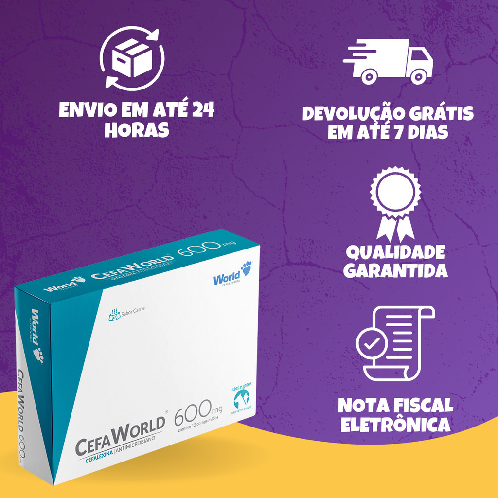 CefaWorld 600mg para Cães e Gatos - 12 Comprimidos - Indicado para cães e gatos; - Comprimidos sabor carne, sulcados e revestidos para maior eficácia, segurança e facilidade de administração; - Disponível em embalagem com 12 comprimidos de 150mg, 300mg e 600mg. Indicação: Cachorros, Gatos Porte/Raça: Raças Pequenas, Raças Médias, Raças Grandes Idade: Filhotes, Adultos, Idosos Apresentação: Disponível em embalagem com 12 comprimidos de 150mg, 300mg e 600mg.