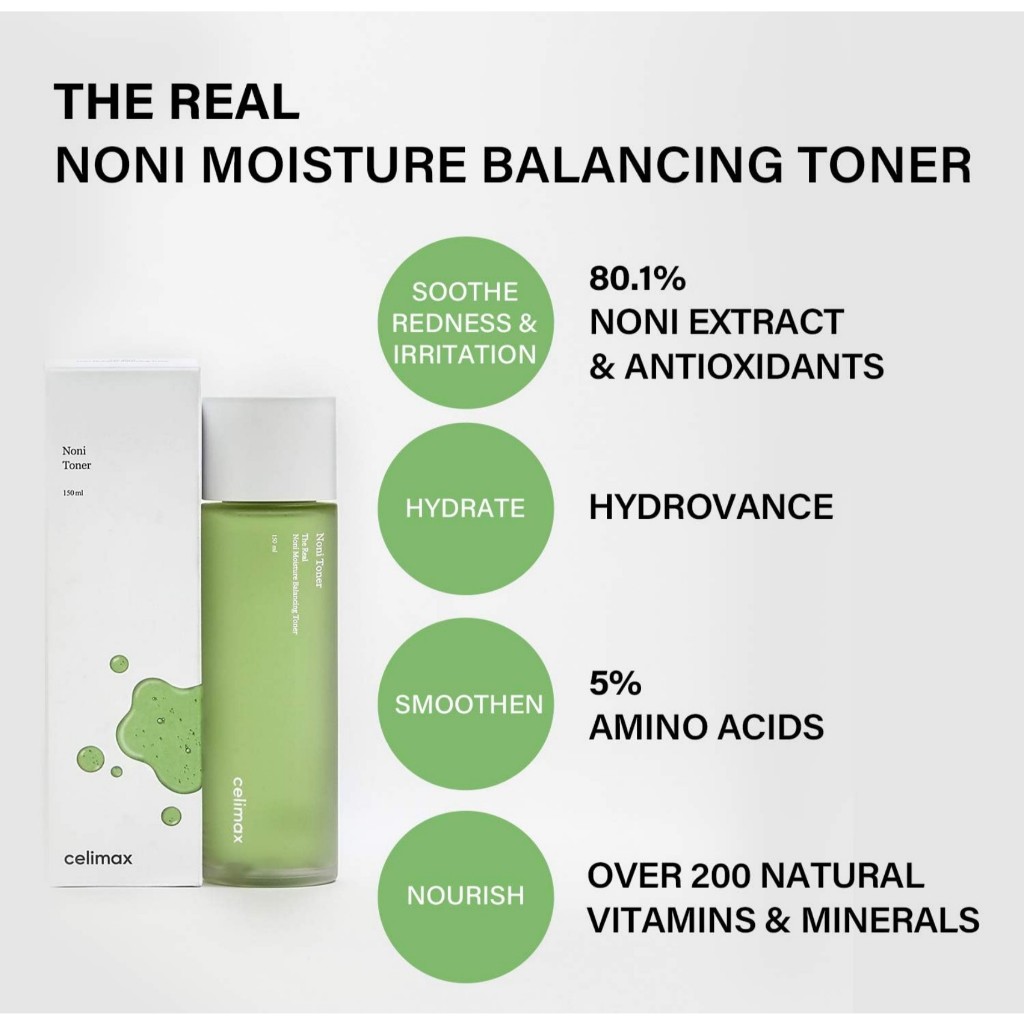 Celimax Noni Moisture Balancing Toner, 150mL - SOOTHING + NOURISHING: 80.1% noni extract, rich in minerals, enhances skin vitality and promotes smoother, healthier skin by addressing visible skin issues. - DEEPLY HYDRATING: HYDROVANCE, a patented ingredient, quickly penetrates the skin to offer deep hydration. - EXFOLIATING: 5% Amino Acids work as a gentle exfoliator to effectively improve the texture. - SKIN-REPAIRING: Low pH, lightweight formula helps to repair skin. - LIGHTWEIGHT: Watery texture offers a fresh, light finish without leaving greasiness. Suitable for AM & PM use. - CLINICALLY TESTED: Dermatologist tested. All data proved by clinical tests from Korea. Paraben, SLS, Artificial Colorant Free, suitable for sensitive skin. - SKIN PATCH TEST: Kindly apply a small amount of the product to a small area of your skin to monitor for any potential skin reactions. For external use only.