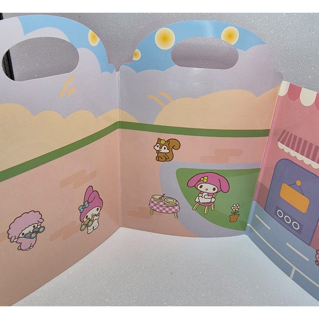 Livro Cenário com adesivos. Crie lindas histórias, troque as roupas e móveis de lugar com os personagens da Sanrio: Kuromi, My Melody e Cinnamoroll. O valor refere-se a uma unidade do livro.