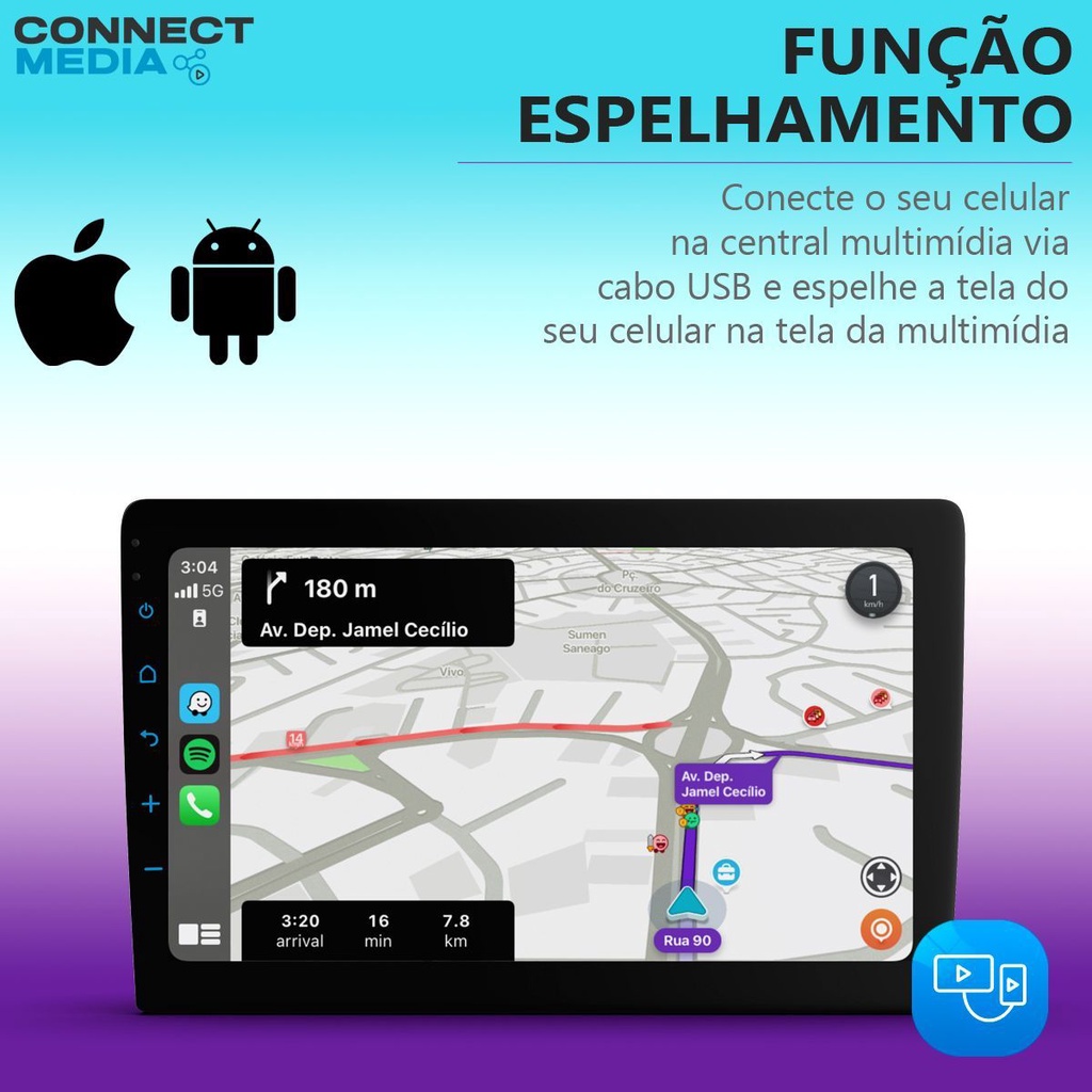 CONNECT MEDIA MP5 9 POLEGADAS UNIVERSAL - FT-MM-CM9 - FAAFTECH CARACTERÍSTICAS • Aparelho homologado ANATEL: 14451-23-16000 • Conectividade com Apple CarPlay e Android Auto VIA CABO • Espelhamento de Smartphone (Android e IOS) VIA CABO • Entrada para controles de volante* • Tela de vidro 2.5D de 9 polegadas com resolução de 1024x600 Capacitivo • Formato 2Din • Entrada USB • Bluetooth • Entrada para câmera de ré • Saída de áudio: 4x50w • Saída para Subwoofer Apresentamos a linha ConnectMedia, centrais multimídia de alta performance, oferecendo conectividade com Apple CarPlay e Android Auto, além de um excelente custo-benefício. Tela de vidro 2.5D de alta resolução, interface gráfica moderna e entradas para câmeras traseira e frontal para manobras ainda mais seguras. TOUCH SCREEN CAPACITIVO Navegue com agilidade e precisão na nossa tela touch capacitiva, projetada para uma resposta imediata e interação intuitiva. TELA DE 9" ALTA RESOLUÇÃO Desfrute de vídeos em detalhes cristalinos na nossa vibrante tela de 9 polegadas de alta resolução, otimizada para clareza e cor. CONECTIVIDADE CARPLAY E ANDROID AUTO Integre seu smartphone para acessar seus apps favoritos de música e navegação diretamente no painel do seu carro. ESPELHAMENTO IOS E ANDROID Espelhe os aplicativos do seu smartphone na tela da central, garantindo acesso fácil e rápido às suas funcionalidades preferidas. TELA DE VIDRO 2.5D Desfrute da elegância e sensibilidade aprimorada de uma tela de vidro 2.5D, unindo estilo e funcionalidade de forma harmoniosa. ENTRADA PARA CÂMERA DE RÉ E FRONTAL Facilite suas manobras com entradas para câmeras traseira e frontal, garantindo visão ampla e segura do entorno do veículo. BLUETOOTH Realize chamadas hands-free e transmita músicas com clareza e eficiência através da versão otimizada do Bluetooth 5.4. VÍDEO E MÚSICA DO USB Acesse e reproduza seus clipes e músicas favoritos rapidamente com nossas entradas USB intuitivas e práticas. CONECTIVIDADE AMPLIADA A nossa central oferece duas portas USB para smartphone e pendrive, entrada AV reversivel para TV Digital ou câmera frontal e saídas de áudio especializadas, inclusive para subwoofer. A saída de vídeo aprimora o entretenimento traseiro, e a entrada para câmera traseira eleva a segurança. Explore um mundo de conexões! CERTIFICAÇÃO ANATEL: SUA GARANTIA DE SEGURANÇA E CONFORMIDADE A certificação ANATEL não é apenas um requisito, mas uma garantia de segurança e qualidade. Assegura que o produto atende às normas rigorosas de segurança do usuário e compatibilidade eletromagnética. Para os revendedores, é uma proteção contra riscos de multas e sanções, garantindo a legalidade e a confiança na comercialização. ESPECIFICAÇÕES • Rádio: FM 87.50MHz-107.9MHz • Bluetooth: 5.4 HFP+A2DP • Tela: LCD de 9 Polegadas • Resolução de Tela: 1024×600 • Toque de Tela: Capacitivo • Proporção de Tela: 16:9 • Sistema de Vídeo: NTSC • Saída de Áudio: 4 x 50W • Impedância: 4 Ohms • Tensão de Operação: 10.5-16V • Consumo em Stand-By: 2mA • Temperatura de Operação: -20 ~ 70°C • Temperatura de Armazenamento: -40 ~ 85°C • Iluminação dos botões: RGB MÍDIAS SUPORTADAS • Vídeo: MP4, AVI, DIVIX, VOB, FLV, MKV, • MPG, RM, RMVB, VOB, DAT, MP2, 3GP • Áudio: MP3, WMA, AAC, FLAC e WAV • Imagem: BMP, JPEG, GIF e PNG BLUETOOTH • Bluetooth Audio Streaming (Músicas) • Bluetooth Hands-Free (Chamadas Telefônicas) CONEXÕES • 2 Entradas USB traseiras • Entrada para câmera traseira • Entrada AV/câmera frontal • Saídas de vídeo para telas traseiras • Saída de áudio RCA para amplificador • Saída para Subwoofer • Entrada de comandos de volante para • carros com sistema resistivo • Entrada para antena de Rádio ITENS INCLUSOS • Central multimídia ConnectMedia Universal de 9″ • Chicote padrão ISO • 2 Chicote extensão USB • Chicote de entrada de câmera • Chicote de Conectividade RCA diversos