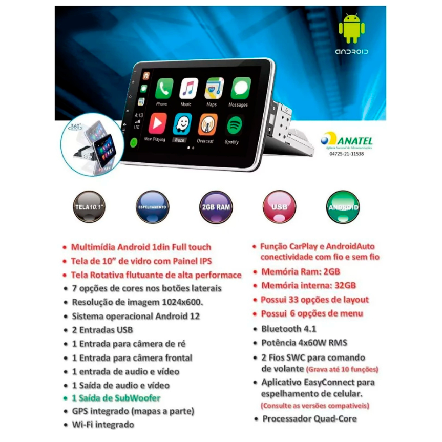 A Oestesom traz até você mais um super produto, entregando tecnologia de ponta e alto desempenho. A multimídia conta com tela de 10" rotativa flutuante com sistema Android 12 na própria mídia, possibilitando assim que você baixe nela os mesmos aplicativos que você utiliza no seu smartphone. Conta ainda com entrada para comandos de volante para não perder a originalidade do seu veículo, e ainda espelhamento Android e IOS. Utilize todos os recursos de seu Smartphone ou iPhone dentro de seu carro através desta incrível tela de 10" através do Apple Carplay, Android Auto ou Mirror link. Acesse à internet dentro de seu veículo: WiFi (Roteie a Internet do seu celular na central, ou conecte-se a qualquer ponto de acesso Wi-Fi). MULTIMÍDIA ANDROID 12 - TELA ROTATIVA FLUTUANTE • Espelhamento de Smartphone (Android e IOS) • Carplay e Android Auto sem fio e com fio • Sistema Operacional Android 12 • Tela de vidro com painel IPS • Tela de 10 polegadas com resolução de 1024x600 • Google Play • Entrada USB • Bluetooth • Entrada para câmera de ré e câmera Frontal • Encaixe para 1 DIN • 2GB de Memória RAM • 32GB de Memória interna INFORMAÇÕES TÉCNICAS: - Multimídia Android 1 Din Full Touch - Tela de 10" de vidro com painel IPS - Tela Rotativa flutuante de alta performance - 7 opções de cores nos botões laterais - Resolução de imagem: 1024x600 - Sistema Operacional: Android 12 - 2 entradas USB - 1 entrada para câmera de ré - 1 entrada para câmera frontal - 1 entrada de áudio e vídeo - 1 saída de áudio e vídeo - 1 saída de subwoofer - GPS integrado (mapas a parte) - Wi-Fi integrado - Processador Quad-Core - Função CarPlay e Android Auto - conectividade com e sem fio - Memória RAM: 2GB - Memória interna: 32GB - Possui 33 opções de layout - Possui 6 opções de menu - Bluetooth 4.1 - Potência: 4x60W RMS - 2 fios SWC para comando de volante (Grava até 10 funções) Alguns carros pdoe precisar de interface. Consulte ! - Aplicativo EasyConnect para espelhamento de celular - Espelhamento Android e IOS - Anatel: 04725-21-11538 - Multimídia com medias no padrão chinês CONTEÚDO DA EMBALAGEM: - Central Android 12 com tela de 10" (H-TECH ou E-TECH) - Antela para GPS - Chicote de ligação completo - Manual de instruções. *Obs: Não acompanha cinta de fixação.
