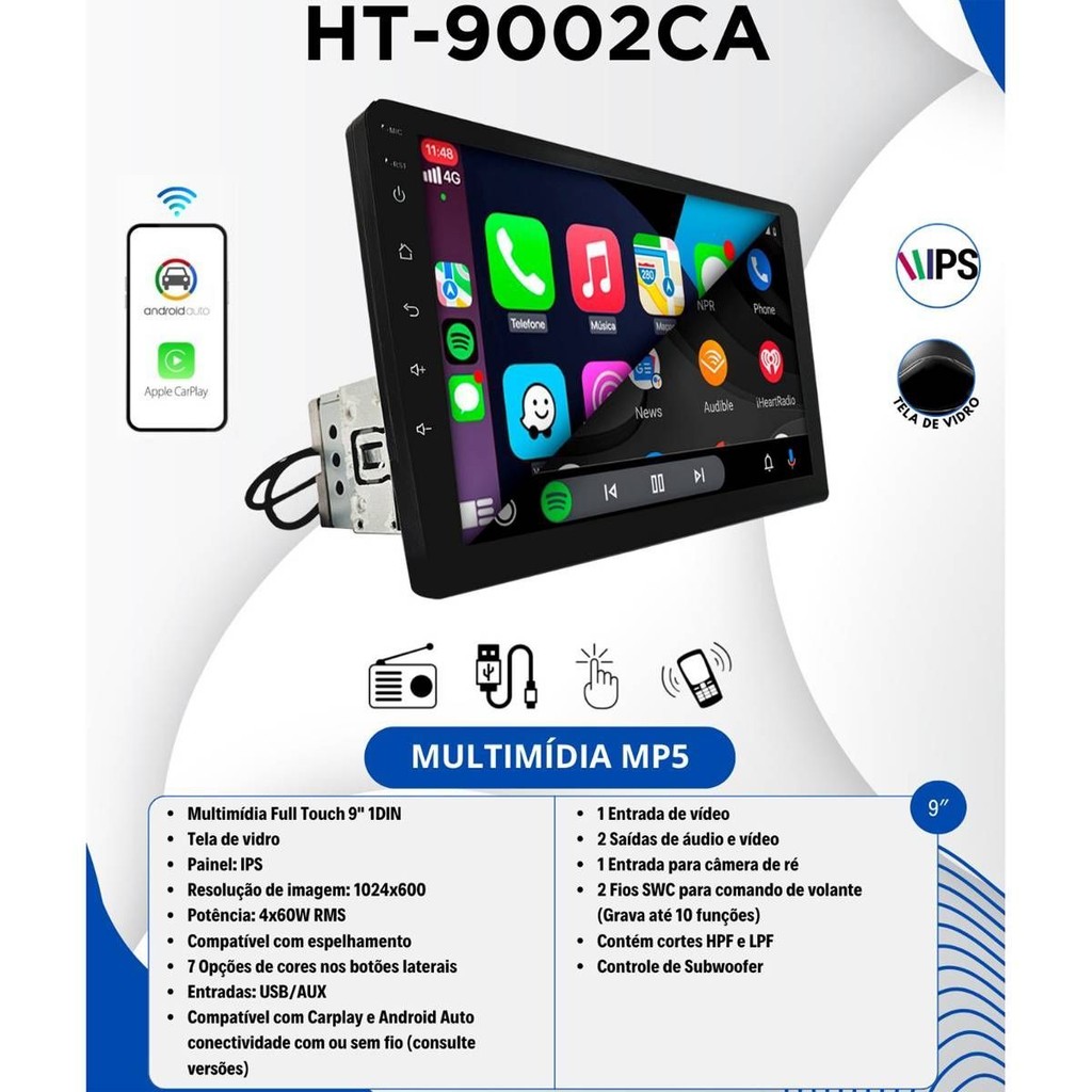H-Tech HT-9002CA Central Multimidia Mp5 9 Polegadas Encaixe 1Din Características • Monitor 9" Full Touch IPS de vídro • Mp5 / Mp4 / Mp3 / WMA • Carplay e Android Auto conectividade com ou sem fio • Espelhamento de celular Android e iOS com fio • Entradas: USB / Bluetooth • Rádio FM • Equalizador Jazz, Pop, Classic, Rock • Potência: 4x60w RMS • Entrada para câmera de ré (Câmera não Inclusa) O MP5 Player é o companheiro perfeito para motoristas e passageiros que enfrentam longos deslocamentos e que não abrem mão de um bom entretenimento. Com ele será possível reproduzir os principais formatos de mídia por meio de uma tela sensível ao toque, por bluetooth ou por meio de sua entrada USB. MP5 Player Automotivo H-Tech HT-9002CA Tela Touch Screen 9 Polegadas Bluetooth Espelhamento Smartphone Android e IOS e USB. Se você passa muito tempo no trânsito, um bom MP5 Player Automotivo pode fazer a diferença nas suas viagens. Por isso, conheça a central multimídia 9 polegadas com tela touch screen que tem os melhores recursos para quem quer ouvir boa música, ver vídeos e ficar por dentro das notícias no dia a dia. O aparelho de som automotivo HT-90012CA tem Bluetooth que permite atender chamadas telefônicas e ouvir músicas direto do celular. Você também pode contar com a função de espelhamento de tela para smartphone. O MP5 Player 1 Din possibilita que você acesse seus aplicativos com total praticidade. E ainda pode contar com entrada USB. O MP3 player universal ainda tem sintonização de rádio FM com memória. Especificação: • Modelo: HT-9002CA • Multimídia MP5 • Tela de 9 polegadas com Encaixe 1 Din e 2 Din • Resolução: 1024x600 pixels • 7 opções de cor no painel • Touchscreen IPS de vidro • Entrada USB • Bluetooth • Espelhamento via Cabo USB Android e iOS • Carplay e Android Auto conectividade com ou sem fio • Tela de vidro IPS • Potência 4 canais de 60W RMS • Rádio FM • Equalizador: JAZZ/ ROCK/ POP/ CLASSIC • Entrada para câmera de ré • 1 Entrada de vídeo • 2 saídas de áudio e vídeo (utilizado para telas traseiras) • 2 Fios SWC para comandos de volante. (Alguns carros podem precisar de interface vendida à parte) • Áudio: MP3, WMA, WAV, FLAC, OGG, APE • Vídeo: RM, RMVB, VCD, DIVX, XVID, MP4, H264, FLV, 3GP, AVI, ASF • Imagem: JPEG, PNG • Padrão Chinês de encaixe 1Din e 2Din • Linguagens Disponíveis no Menu em Português, Inglês, Espanhol • Medidas do aparelho: 23 x 13 x 12cm (Largura x Altura x Profundidade) Itens Inclusos • 01 Central Multimídia H-Tech HT-9002CA • 01 Cabo USB • 01 Chicote padrão 16 vias • Manual de instruções