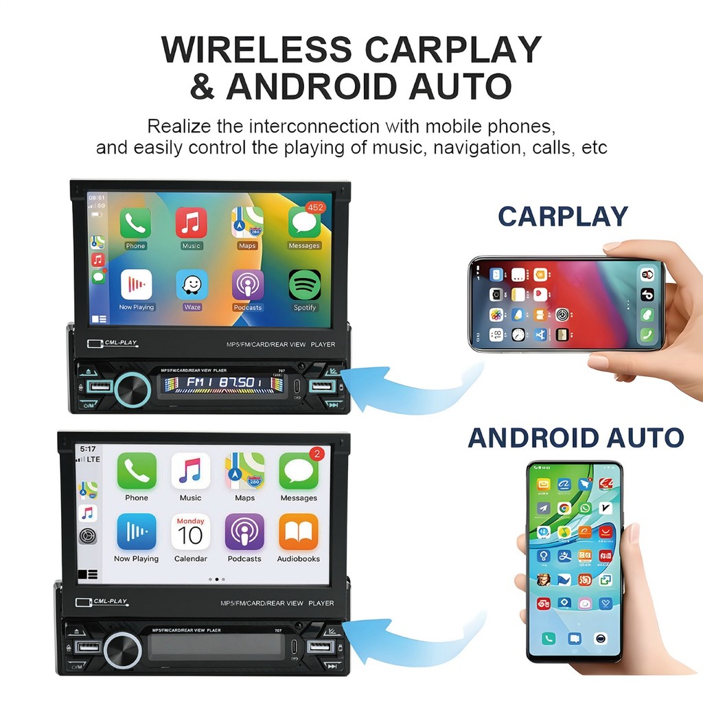 Central Multimidia Retrátil 7 Polegadas Bluetooth Android Auto Rádio Carro USB GPS