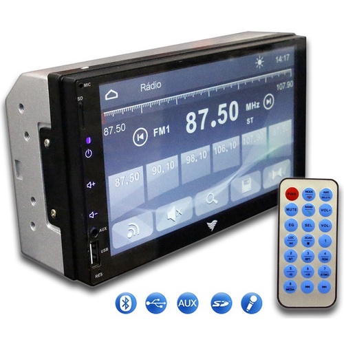 # OESTESOM # Dvd 2 Din Multimidia Bluetooth Usb Sd Tela 7 Hd Espelhamento Frequência FM: 87,5 MHz - 108 MHz - Entradas: USB, cartão de memória SD / Auxiliar - Conexão Bluetooth - Suporta reprodução de vídeo HD (1080p) - Formatos de áudio suportado: MP1, MP2, MP3, WMA, WAV, FLAC, OGG, APE - Formatos de vídeo suportados: RM / RMVB / MP4 / MP5 / AVI / FLV / H263 / H264 / 3GP / SWF / ASF / MJPEG - Formatos de imagem suportados: JPEG / PNG / GIF etc. - Resposta de frequência: 20Hz a 20KHz - Relação sinal-ruído: 50dB - Alcance do rádio: 10.7MHz - Controle de som: ± 8 dB - Botões com iluminação de LED - Entrada para câmera de ré - Função relógio e mudo - Controle de graves e agudos - Dimensões aproximadas do produto (AxLxP): 10 x 17,2 x 6,5 cm OESTESOM A MELHOR LOJA DE PRODUTOS AUTOMOTIVOS NA INTERNET!