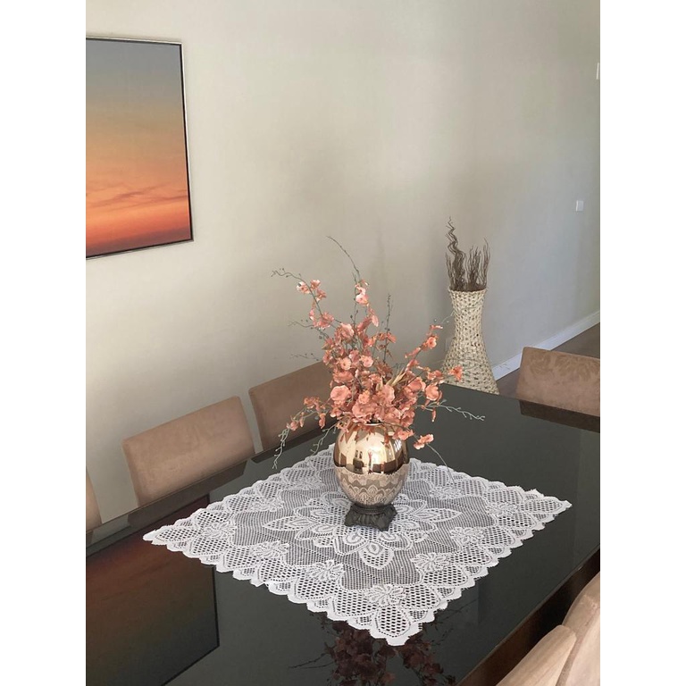 Deixe sua mesa mais sofistica e bonita com o centro mesa Rendado, material produzido em cor branca na qual confere um toque mais clean ao ambiente deixando sua mesa de jantar mais decorada. Centro de Mesa Tamanho 0,80m x 0,80cm Tecido: Renda - 100% Poliéster Contem: 1 unidade do centro de mesa PERGUNTAS FREQUENTES - Quanto tempo leva para enviar o meu pedido? R: Após a confirmação do pedido, levamos de 12 a 24 horas para realização do envio (exceto Sábado, Domingo e Feriados). 2- Produto tem procedência? R: Sim, todos nossos produto são de otima qualidade ### MUITO IMPORTANTE ### - PEDIMOS QUE GUARDE A EMBALAGEM DE ENVIO POR PELO MENOS 30 DIAS, POIS SE HOUVER ALGUM CONTRATEMPO COM O PRODUTO, PRECISAREMOS DE INFORMACOES CONSTANTE NELE PARA RESOLUCÃO DO PROBLEMA. - Todos os produtos são acompanhados com DULPA embalagem plástica impermeável, garantindo que o produto chegue ao cliente em perfeito estado e sem nenhum avaria. - Produto com garantia de 90 dias para defeitos de fabricação, 7 dias corridos para desistência de compra. Casa linda. Deixando seus dias melhores.
