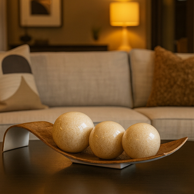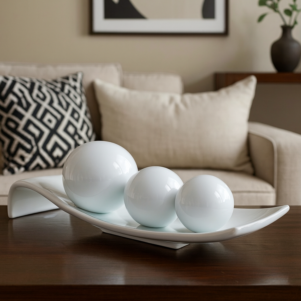 Centro de Mesa Decorativo com 3 Esferas Modelo Safira Enfeites de Mesa Decoração para Sala Entrega Full (Postagem em 1 dia Útil) Produto com Garantia de 30 Dias Selo de Vendedor Indicado Suporte Exclusivo via chat POR QUE TER UM CENTRO DE MESA? O centro de mesa é um charme a mais em qualquer decoração. Além de decorar a mesa, o rack, um painel ou qualquer outro móvel onde esteja, ele tem o poder de proporcionar aquele ar de aconchego, e ainda são muito funcionais, perfeitos para guardar pequenos objetos como chaves, entre outros. CARACTERÍSTICAS: Material: Cerâmica. Itens Inclusos: 1 Base + 3 esferas. DIMENSÕES: Centro de Mesa: 50 cm x 15 cm. Esferas: G: 13cm / M: 10cm / P: 8cm. Adquirindo nossos produtos, você receberá em casa peças de altíssima qualidade, totalmente protegidas em uma caixa que será preparada com total responsabilidade e carinho por nossa Equipe. DIFERENCIAIS DA NOSSA LOJA SATISFAÇÃO GARANTIDA (Equipe responsável com + de 10 colaboradores totalmente preparados para atender prontamente qualquer dúvida ou problema dos clientes) Suporte Qualificado e Eficaz tanto no pré, quanto no pós venda GARANTIA DE QUALIDADE (Centenas de Pedidos já Enviados para + de 20 Estados com nível altíssimo de satisfação.) GARANTIA DE EXCLUSIVIDADE (Nossas peças são totalmente exclusivas, contém proteção aveludada na base, pensada cuidadosamente para evitar qualquer atrito com o móvel a ser decorado.) EMBALAGEM SEGURA E SINALIZADA PARA A TRANSPORTADORA OBTER TODO O ZELO QUE PREZAMOS. CUIDADOS COM AS PEÇAS: Para que a durabilidade seja maior, limpe utilizando um pano seco ou uma esponja macia. Não use nenhum material áspero, molhado ou produto abrasivo. Tenha cuidado para não bater o objeto, uma vez que qualquer batida pode lascar ou quebrar a peça.