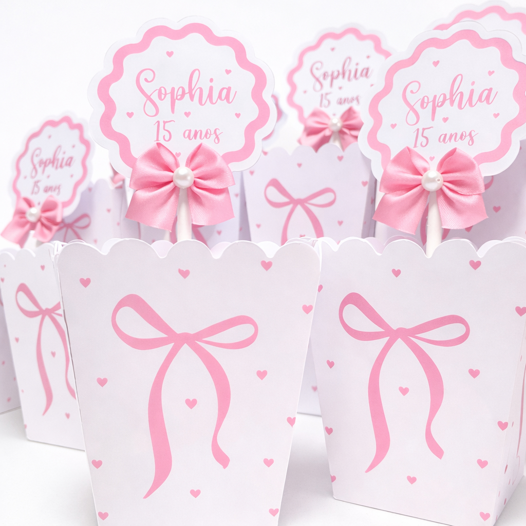 Centro de mesa decorativo para festa menina tema laços cachepot personalizado com laço cor rosa