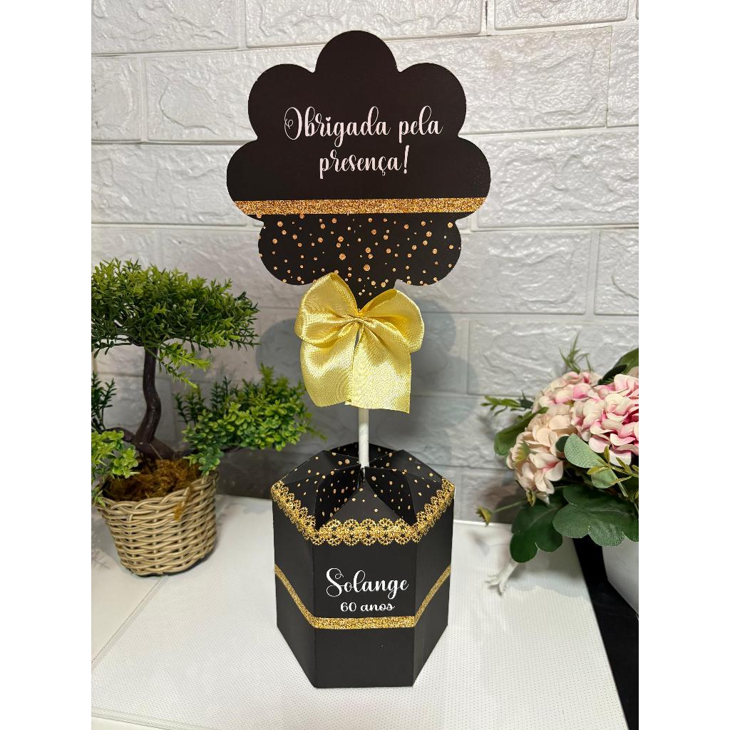 CENTRO DE MESA OBRIGADA PELA PRESENÇA ( DOURADO OU PRATA)