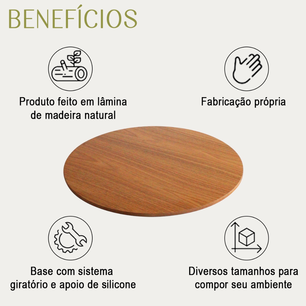 O Prato Giratório Decore Casa é uma escolha funcional e elegante para a mesa-posta. Sua base giratória permite compartilhar alimentos com facilidade para todos na mesa, tornando-o perfeito para ocasiões especiais, como buffets e festas, bem como para uso diário. Construído com BP laminado de alta qualidade, é altamente resistente a manchas e riscos, garantindo durabilidade ao longo do tempo Sua versatilidade o torna adequado tanto para uso cotidiano quanto para ocasiões especiais, sendo elegante e prático ao servir alimentos. Seja para servir pratos principais, petiscos ou sobremesas, sua capacidade de acomodar diferentes alimentos torna-o indispensável em qualquer refeição. O Prato Giratório combina funcionalidade e estilo, sendo uma adição versátil e durável para a sua mesa. OBS: Pode haver uma pequena diferença de cor de acordo com sua tela. Especificações técnicas: - Altura: 3 cm - Largura: 60 cm - Comprimento: 60 cm - Peso: 3,6 kg - Material: BP Laminado - Acabamento: Lixado e envernizado (Verniz acetinado) - Espessura do BP: 12 mm - Sistema giratório: BP+ esferas de metal - Necessita montagem: Não - Diâmetro da Base: 35 cm - Espessura da Base: 9 mm - Sugestões de Uso: Perfeito para servir à mesa, em confraternizações, buffets, festas e eventos especiais. Durabilidade: Para preservar seu prato é importante seguir cuidados como limpeza regular com um pano macio e levemente umedecido. Evite expor a água ou umidade, nunca use objetos cortantes, ásperos ou abrasivos.