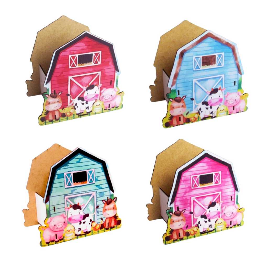 Centro Mesa Cachepo Celeiro Vermelho , rosa , verde e azul Animais mdf Adesivado fazendinhas festas e aniversários