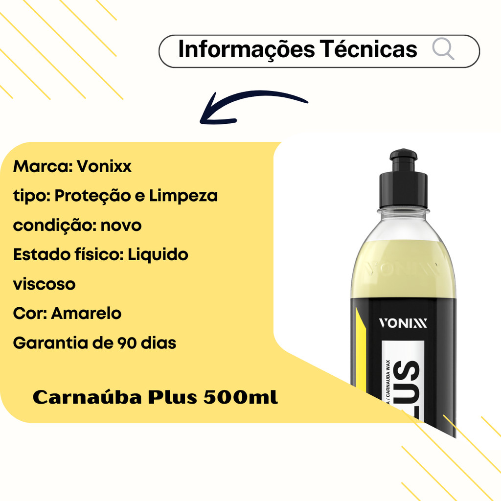 🚗 Carnaúba Plus 500ml – Proteção e Limpeza Premium ✨ Desenvolvida com a mais pura cera de carnaúba cearense, limpa, protege e promove brilho profundo. 🔎 Referências Compatíveis: 35305, 2009004 🏷️ Informações do Produto: 🏢 Marca: Vonixx 📝 Tipo: Proteção e Limpeza 🆕 Condição: Novo 💧 Estado Físico: Líquido viscoso 🟡 Cor: Amarelo 🛡️ Garantia: 90 dias ⚠️ Importante: Não recomendamos uso em pinturas (lataria), pois pode ocasionar manchas. 🛠️ Aplicações 🛡️ Forma camada protetora sobre verniz da pintura automotiva 💎 Proporciona brilho intenso e espelhado 🚗 Ideal para detalhamento automotivo (car detailing) 💦 Ação hidro-repelente: efeito “beading” – gotas escorrem com facilidade 🌟 Benefícios 🛡️ Proteção da Pintura: Raios UV, chuva ácida, poluição, fezes de pássaros e seiva 💎 Brilho Intenso: Efeito molhado (wet look), realce da cor 🧽 Facilidade na Limpeza: Repele sujeira, poeira e água 💦 Efeito Beading: Água escorre mais fácil, reduzindo manchas 🤲 Fácil Aplicação e Remoção: Fórmula líquida, sem resíduos difíceis 🔄 Versatilidade: Pintura, plásticos não porosos, cromados, vidros (com cuidado) ⏳ Durabilidade: Proteção por semanas, dependendo do clima e lavagens 🌱 Componente Natural: Cera de carnaúba – sustentável e brasileira 📝 Modo de Uso 🔄 Agite bem o produto antes de usar 🧴 Aplique pequena quantidade com aplicador de espuma, em movimentos circulares ⏳ Aguarde secar alguns minutos 🧽 Remova com toalha/pano de microfibra limpo e seco até obter brilho desejado 🛒 Adquira agora o Carnaúba Plus 500ml em uma de nossas Lojas Oficiais: Camillo Parts, Genuine Automotive ou Edumac Parts ✅ Produto de alta qualidade, com garantia e suporte que você merece ⚠️ Aviso de Direitos Autorais 🚫 Proibida a cópia, uso ou alteração de nossas fotos, imagens e conteúdo. 📜 Lei 9.610/98 – qualquer violação será tratada legalmente.