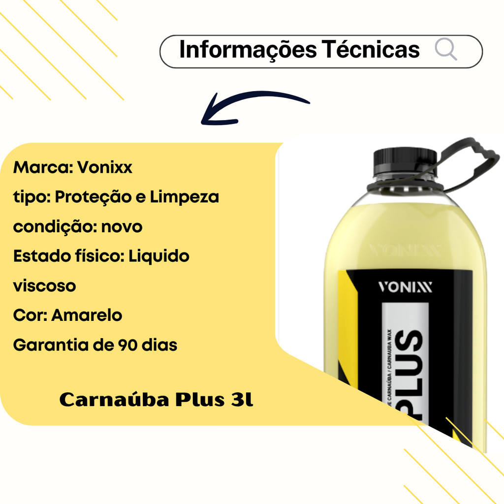 | Cera Automotiva Carnaúba Plus Vonixx 3L este produto | R$ 110,43 | 41% | 5.0/5 | 1 |