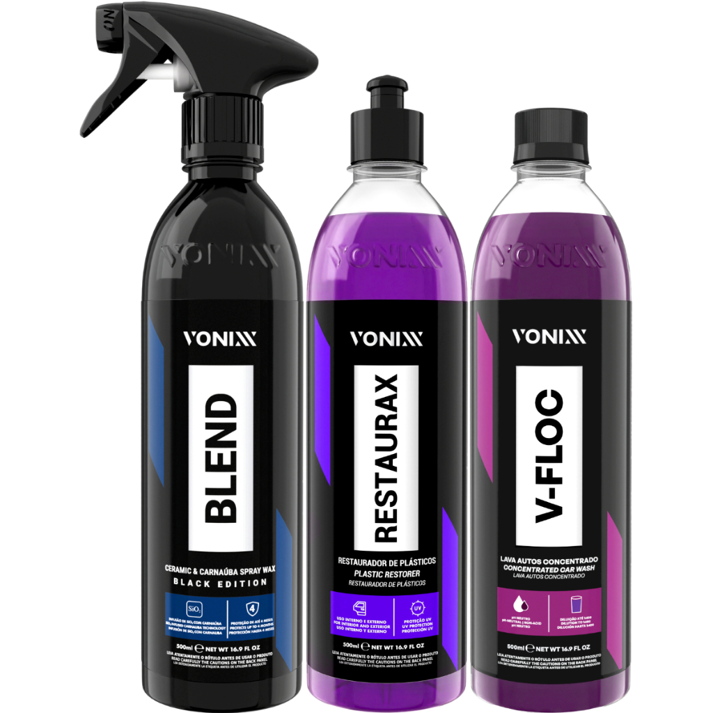 Cera Blend Spray Black para Carros Escuros Vitrificadora + Restaurax Revitalizador + Shampoo V-Floc Vonixx