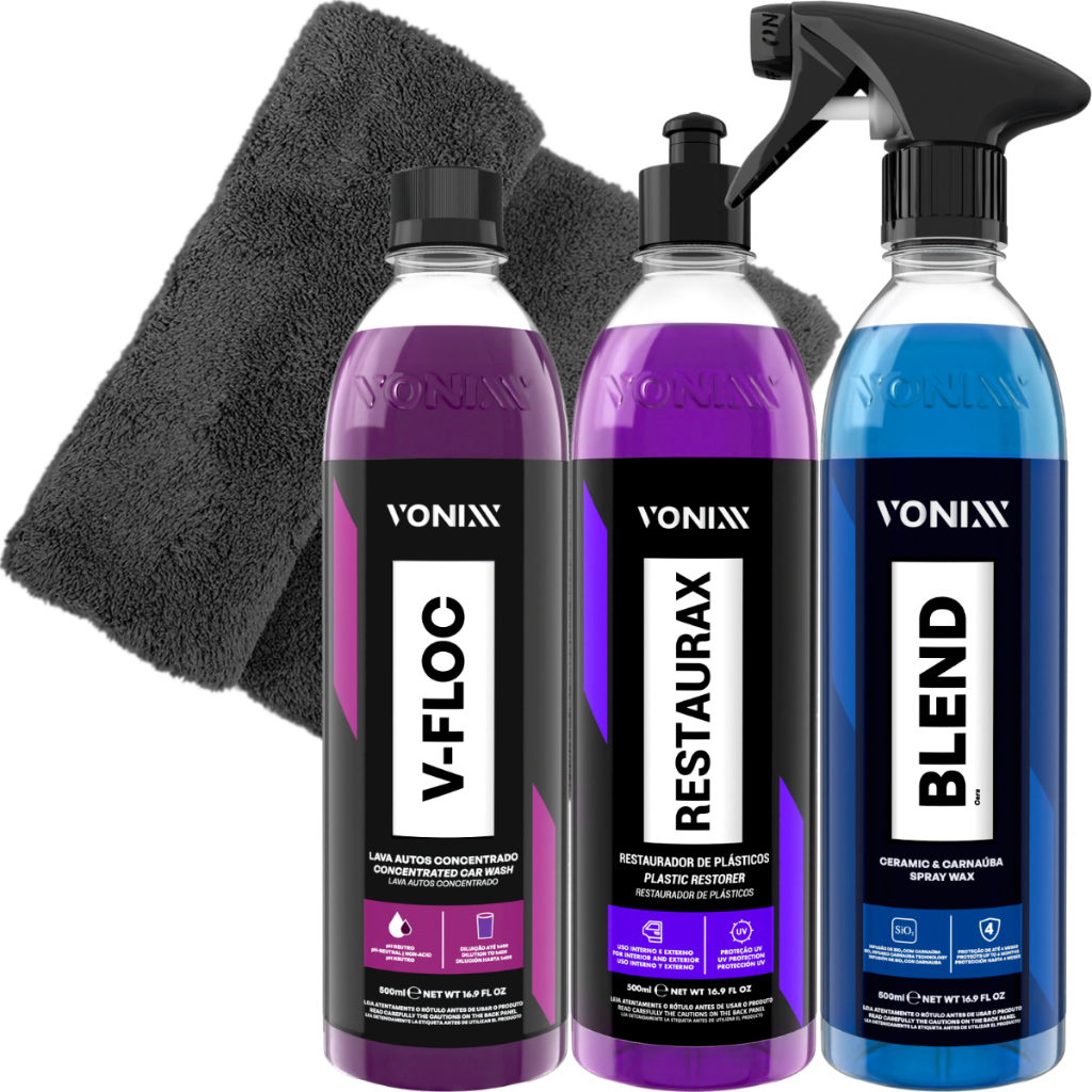 KIT CONTÉM: BLEND SPRAY TOALHA FELPUDA VONIXX RESTAURAX 500ML V-FLOC 500ML --------------------------------------------------- BLEND CERAMIC SPRAY WAX 500ML - CERA LÍQUIDA COM SIO2 E CARNAÚBA DESCRIÇÃO: Blend Ceramic & Carnaúba Spray Wax é uma cera híbrida, composta por SiO2 e pela mais pura carnaúba tipo 1 e que protege a superfície veicular por até quatro meses. O produto promove a resistência cerâmica, brilho quente da carnaúba e hidrorrepelência. DURABILIDADE: Até quatro meses de durabilidade MODO DE USO: 1. Agite bem o produto antes de usar 2. Após lavar o veículo, pulverize uma pequena quantidade do produto na pintura. Mantenha uma distancia de 20 cm em uma área não superior à 60 cm x 60 cm 3. Sem deixar secar, realize o acabamento utilizando toalha de microfibra limpa e seca, até obter o brilho desejado 4. Continue fazendo o processo até a conclusão total do veículo Obs: Em caso de manchas, aplicar novamente o produto. --------------------------------------------------- RESTAURAX 500ML - RESTAURADOR DE PLÁSTICOS DESCRIÇÃO: Restaurax renova e restaura superfícies plásticas, como para-choques, painéis e laterais de portas. Sua fórmula contém polímeros especiais que também protegem as peças contra as ações do tempo, evitando degradação precoce do material. DURABILIDADE: Até seis meses de proteção nos plásticos internos e sessenta dias nos plásticos externos. MODO DE USO: 1. Limpar bem a superfície e em seguida aplicar o produto com um aplicador de espuma até a completa restauração. Se necessário, repetir a operação. 2. Para manter o plástico sempre novo, repetir a aplicação do produto a cada 60 dias na parte externa e a cada 6 meses na parte interna. Obs: Para um resultado com menos brilho, realizar acabamento com uma microfibra. --------------------------------------------------- V-FLOC 500ML - LAVA AUTOS SUPER CONCENTRADO DESCRIÇÃO: V-Floc é um lava autos de alta performance e de pH neutro. Sua fórmula contém agentes condicionadores e tensoativos especiais que proporcionam uma lavagem suave e eficiente. MODO DE USO: 1. Realizar a pré-lavagem do veículo para retirada do excesso de sujeira 2. Diluir aproximadamente 10ml de V-FLOC em 4 litros de água; Recomendamos ajustar a quantidade de produto de acordo com o nível de sujeira 3. Iniciar a lavagem com o auxílio de Luva de Microfibra, sempre começando pela parte superior do veículo 4. Mergulhar a luva na solução e esfregar suavemente, até completar todo o veículo 5. Enxaguar em seguida até a retirada de todo o produto 6. Recomendamos o uso da Toalha de Secagem para finalizar