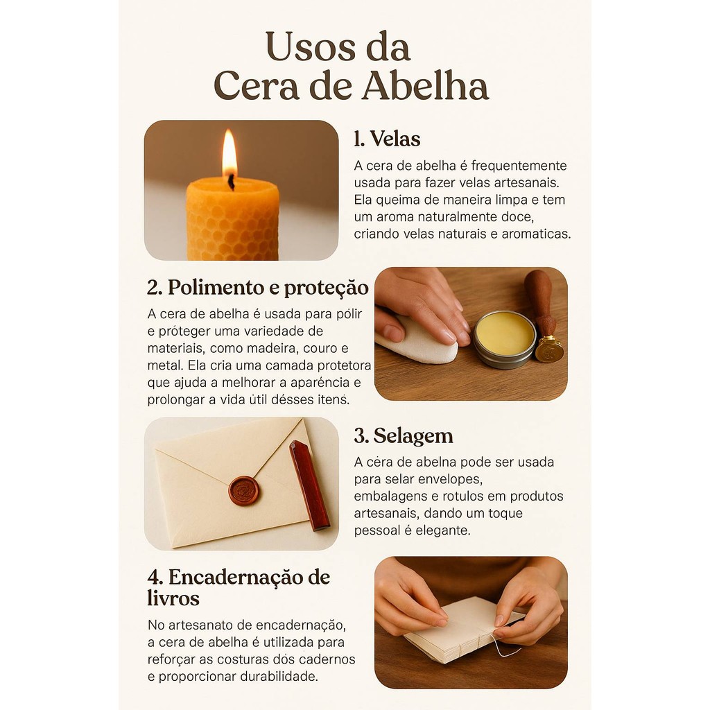 PUREZA E VERSATILIDADE: CERA DE ABELHA NATURAL 100G A Cera de Abelha da Império do Banho é um ingrediente premium, extraído de forma natural para garantir todas as suas propriedades benéficas. Valorizada por ser um produto sustentável e livre de químicos agressivos, ela é a base perfeita para quem deseja criar produtos artesanais com apelo ecológico e alta performance. Sua textura maleável e aroma naturalmente adocicado fazem dela um item indispensável tanto na saboaria e cosmética quanto no artesanato fino e restauração de materiais. POSSIBILIDADES NO RAMO ARTESANAL: » Velas Naturais: Proporciona uma queima limpa, duradoura e com perfume doce natural. » Polimento e Proteção: Ideal para impermeabilizar e dar brilho em madeira, couro e metais. » Selagem Criativa: Use para selar envelopes e rótulos, conferindo um toque rústico e elegante. » Encadernação: Excelente para reforçar costuras de cadernos artesanais e garantir durabilidade. APLICAÇÕES NA COSMÉTICA ARTESANAL: » Bálsamos e Batons: Forma uma barreira protetora que retém a umidade nos lábios e na pele. » Maquiagem Natural: Ajuda a criar texturas cremosas e de longa duração em blushes e sombras. » Cuidados com a Pele: Fornece emoliência e proteção em loções, cremes e pomadas. » Modelagem Capilar: Utilizada em ceras e pomadas para fixação flexível e brilho natural. CARACTERÍSTICAS DO PRODUTO: » Peso: 100g. » Origem: Extração natural (pode conter pequenos vestígios naturais do favo). » Aspecto: Maleável e altamente absorvente em misturas oleosas. OBSERVAÇÃO IMPORTANTE: Por ser um produto de extração natural e artesanal, a cera pode apresentar pequenas variações de cor e conter mínimos resíduos naturais da colmeia na embalagem, o que comprova sua procedência e pureza. DICA DE ARTESÃO: Ao derreter a cera de abelha, utilize sempre o banho-maria para não queimar as propriedades do produto. Ela combina perfeitamente com óleo de coco ou manteiga de karité para a criação de lip balms caseiros incríveis! Império do Banho – Sua criação em outro nível