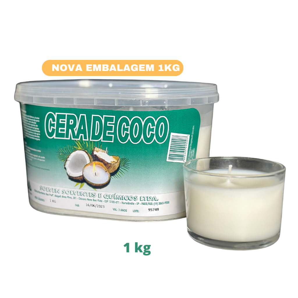 ENVIO IMEDIATO PELA SHOPEE EXPRESS CERA DE COCO 1 KG (NOVA EMBALAGEM) AVISO: POR SE TRATAR DE UM PRODUTO VEGETAL PODE HAVER VARIAÇÃO DE COR (AMARELADA). PRODUTO VEGANO A CERA DE COCO é uma cera de aparência branca, cremosa, com adesão excepcional e composta 100% de ceras vegetais de coco, palmiste e palma. Proveniente de fontes renováveis e possuindo excelente estabilidade química, oferece uma ótima queima e não promove geração de resíduos nocivos à saúde. Apresenta elevado ponto de fulgor o que torna o produto seguro para o manuseio. Devido a sua característica de inércia química e baixa solubilidade, não é considerado passível de causar danos ao meio ambiente. É um produto não tóxico e compatível com todos os tipos de essências e óleos vegetais. A CERA DE COCO é utilizada principalmente na fabricação de velas artesanais, comumente acondicionada em potes e copos de vidro e metal. Deve ser aquecida a uma temperatura máxima entre 65°C a 70°C, sob agitação. Por ser um produto de origem vegetal, ele pode sofrer alterações de coloração caso ultrapasse a temperatura mencionada.