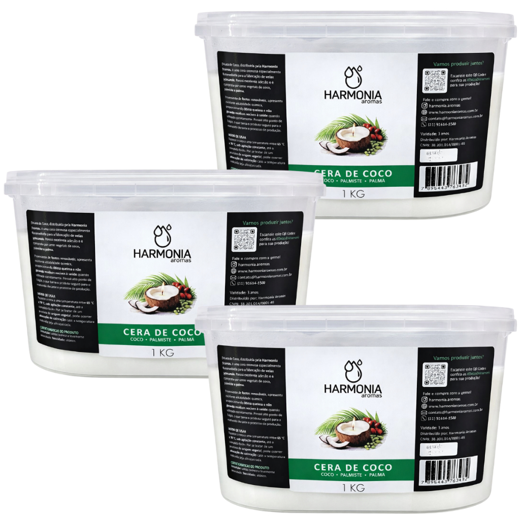 Cera de Coco, Palma & Palmiste 1kg Para Velas Harmonia Aromas Para quem busca queima mais controlada e aroma refinado Se você quer produzir velas com estética branca, clean e exalação delicada, essa é a escolha certa. A Cera de Coco, Palma & Palmiste foi desenvolvida para quem valoriza controle, suavidade e acabamento elegante. Ela é mais firme, mais seca e proporciona uma queima mais fria e estável, ideal para projetos sofisticados. Entenda o comportamento técnico: Essa é uma cera com perfil diferente das ceras de alta projeção. Aqui o foco é refinamento. Características Técnicas: • Derrete de forma mais lenta • Queima mais controlada e fria • Libera aroma de forma suave e gradual • Preserva melhor moléculas sensíveis ao calor • Maior tendência à retração • Aparência mais branca e clean Esse comportamento torna essa cera ideal para quem busca exalação delicada e sofisticada, sem explosão aromática. Perfume mais elegante, resultado mais profissional Algumas famílias olfativas performam melhor nessa base: Sugestão de Aromas Florais Suaves (Melhor Performance) • Peônia • Flor de Algodão • Rosa Branca • Muguet (Lírio do Vale) • Gardênia Suave • Lavanda Delicada Motivo técnico: Como essa cera preserva melhor moléculas sensíveis ao calor, fragrâncias florais delicadas mantêm sua identidade olfativa com mais fidelidade. Além disso, por ter maior tendência à retração, é ideal utilizar recipientes, como: • Vidro âmbar • Vidro fosco • Recipientes pintados Isso equilibra estética e performance da queima. Produza velas mais refinadas com padrão Harmonia Aromas Se você deseja: Velas com visual mais branco e clean Queima mais controlada Exalação suave e sofisticada Melhor preservação de fragrâncias delicadas A Cera de Coco, Palma & Palmiste 1kg Harmonia Aromas é a escolha ideal para elevar o padrão das suas criações. Adicione ao carrinho e transforme sua produção em uma experiência mais elegante e profissional.