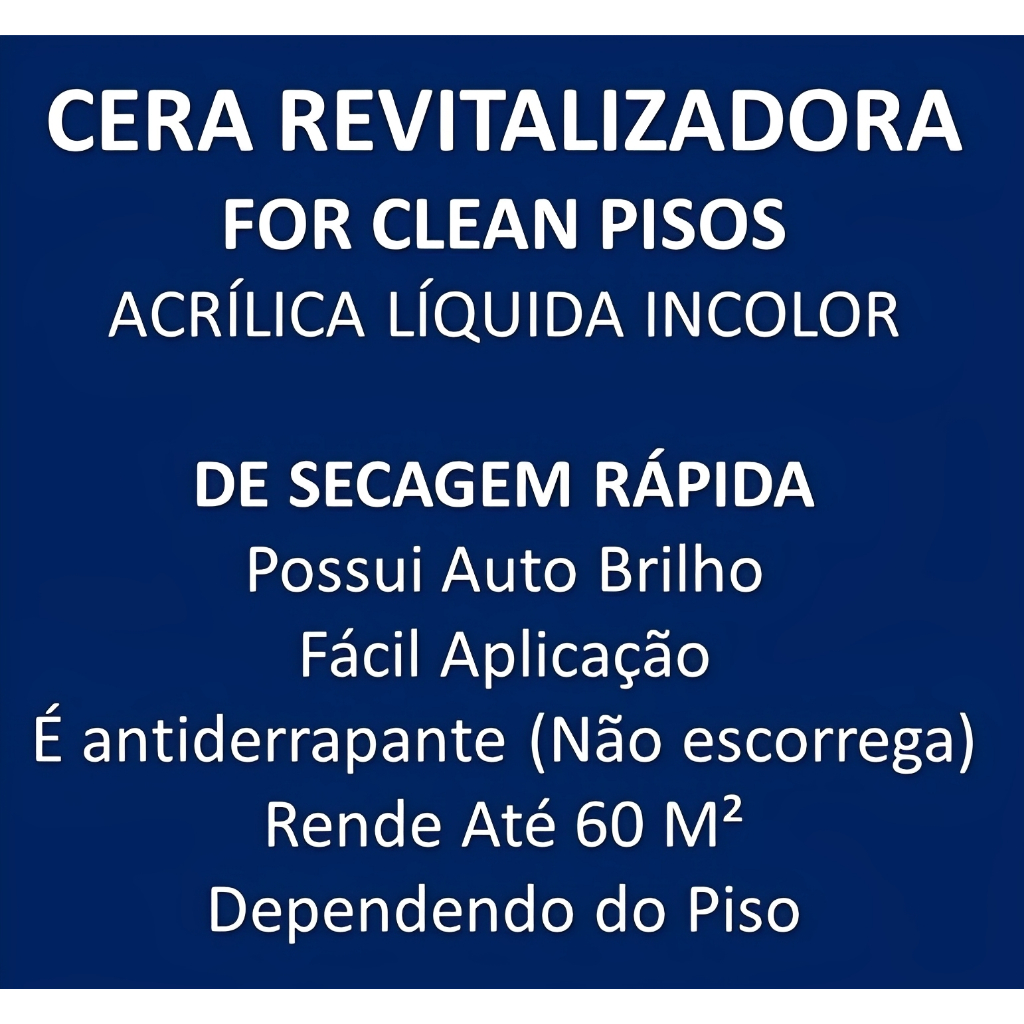 Cera Revitalizadora de Resina For Clean É Ideal para Pisos de Cimentos: Queimado, Industrial, Marmorite, Granilite, Granitina. Foi desenvolvida para proporcionar brilho intenso, proteção duradoura e acabamento impecável em diversos tipos de superfícies. Sua fórmula avançada forma uma película resistente que realça a beleza natural do piso, ao mesmo tempo que cria uma barreira contra sujeiras, marcas e pequenos arranhões. É antiderrapante: Segurança garantida, mesmo com brilho Principais características: • Brilho Acetinado e acabamento profissional • Alta resistência ao tráfego e ao desgaste • Fácil aplicação e secagem rápida • Fragrância suave que deixa o ambiente mais agradável Aplicação: • Pode ser aplicada com pano, mop ou aplicador de espuma • Dispensa uso de enceradeira • Secagem ao toque: 20 minutos • Para melhores resultados: Inicialmente aplicar até 3 camadas com intervalo de 20 minutos O resultado? Um piso com aparência renovada, mais protegido e cheio de vida.