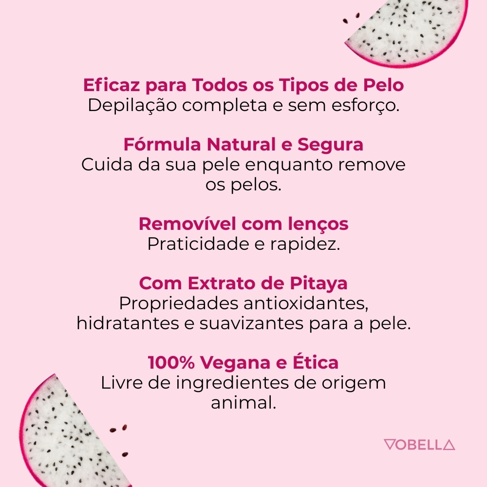 Cera Depilatória Hidrossolúvel Pitaya Depil Bella 1,3kg Depilação eficaz, suave e refrescante com a Cera Depilatória Hidrossolúvel Pitaya Depil Bella. Formulada com extrato de pitaya rosa, ela remove os pelos de forma precisa, sem agredir a pele, proporcionando conforto e cuidado durante todo o processo. Por que comprar a Cera Depilatória Hidrossolúvel Pitaya Depil Bella? Dermatologicamente testada e vegana, essa cera adere apenas aos pelos, inclusive os mais resistentes, garantindo depilação eficiente, menos dolorosa e adequada para todos os tipos de pele e áreas corporais e faciais. Sobre o produto: -Cera Depilatória Hidrossolúvel Pitaya 1,3kg. -Marca: Depil Bella. -Uso corporal e facial. -Dermatologicamente testada. -Vegana e indicada para todos os tipos de pele e pelos. -Enriquecida com extrato de pitaya rosa. -Remove os pelos de forma eficaz, sem agredir a pele. -Adere aos pelos, não à pele, proporcionando depilação suave e confortável. Indicado para: -Quem busca depilação prática, eficaz e menos dolorosa. -Uso em regiões corporais e faciais. Modo de uso: -Coloque o pote sem tampa no micro-ondas e aqueça por aproximadamente 1 minuto. -Misture com a espátula até obter consistência homogênea. -Teste a temperatura na palma da mão antes de aplicar. -Com a pele limpa e seca, espalhe a cera com espátula no sentido do crescimento dos pelos. -Coloque o lenço depilatório sobre a cera, aguarde alguns segundos e retire na direção oposta ao crescimento. -Finalize com produto pós-depilação para acalmar e hidratar a pele. Precauções: -Uso externo. -Evitar contato com olhos e mucosas. -Manter fora do alcance de crianças. Com fórmula vegana, dermatologicamente testada e efeito refrescante, a Cera Depilatória Hidrossolúvel Pitaya Depil Bella garante depilação eficaz, confortável e delicada para todos os tipos de pele. Experimente agora! Surgiu alguma dúvida? Entre em contato com a gente! Boas Compras :)