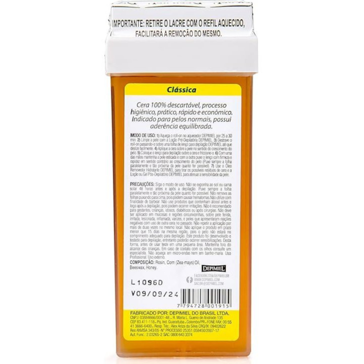 A Cera depilatoria roll-on Depimiel foi criada especialmente para agilizar o processo de depilação em salões de estética, profissionais de beleza e por depiladoras. A cera Depimiel possui sistema roll-on para deslizar facilmente pela pele, proporcionando precisão, eficiência e maior economia. A cera de depilação Clássica contem ingredientes a base de mel com aderência equilibrada, indicada para pelos normais. O mel e um ingrediente natural rico em vitaminas e enzimas com poder restaurador e rejuvenescedor para a pele. Proporciona limpeza profunda enquanto hidrata e nutre gradativamente para deixar a pele macia e saudavel. A cera e 100% descartavel para garantir higiene e bem estar, devendo ser usada 1 unica vez por cliente. Apos o uso, a embalagem deve ser descartada em local apropriado. - Possui aderência equilibrada. - Cera 100% descartável - Processo higiênico, prático, rápido e econômico - Textura extremamente fina e depilação eficiente - Para todo tipo de pele - Modelo Universal -Compatível com a maioria dos aparelhos rollons Conteúdo: 100g Fabricante: Depimiel