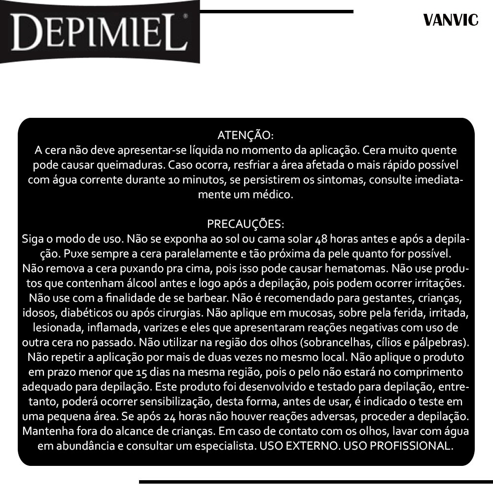 ITENS INCLUSOS: - 1 Cera Depimiel em Tabletes Negra com Lama Negra 1kg. Produto 100% Original, com garantia e nota fiscal. A cera depilatória Negra com Lama Negra é um produto inovador desenvolvido especialmente para depiladoras que buscam um resultado eficaz e duradouro. Essa cera é capaz de remover até os pelos mais grossos e resistentes, deixando a pele suave e macia por semanas. A lama negra presente na fórmula é um ingrediente natural que ajuda a hidratar e nutrir a pele. Sua textura cremosa e fácil de aplicar permite uma depilação mais rápida e menos dolorosa. Conselho de Aplicação: 1) Aqueça a cera na Termocera Depimiel ou coloque-a em um recipiente adequado (metálico), aquecendo em banho-maria ou fogo baixo. 2) Deixe esfriar. Com uma espátula, mexa a cera até que fique com uma consistência homogênea e cremosa. Verifique a temperatura da cera colocando uma pequena quantidade do produto no antebraço. Se estiver em uma temperatura suportável inicie a depilação. 3) Com uma espátula, aplique uma camada fina de cera em direção ao crescimento dos pelos. 4) Deixe secar por alguns segundos , estique a pele e puxe a cera com firmeza e rapidez, em sentido contrário ao crescimento dos pelos. 5) Use o Óleo Removedor DEPIMIEL para retirar possíveis resíduos de cera da pele e finalize com a Loção ou Gel Pós-Depilatório DEPIMIEL. ATENÇÃO: A cera não deve apresentar-se líquida no momento da aplicação. Cera muito quente pode causar queimaduras. Caso ocorra, resfriar a área afetada o mais rápido possível com água corrente durante 10 minutos, se persistirem os sintomas, consulte imediatamente um médico. PRECAUÇÕES: Siga o modo de uso. Não se exponha ao sol ou cama solar 48 horas antes e após a depilação. Puxe sempre a cera paralelamente e tão próxima da pele quanto for possível. Não remova a cera puxando pra cima, pois isso pode causar hematomas. Não use produtos que contenham álcool antes e logo após a depilação, pois podem ocorrer irritações. Não use com a finalidade de se barbear. Não é recomendado para gestantes, crianças, idosos, diabéticos ou após cirurgias. Não aplique em mucosas, sobre pela ferida, irritada, lesionada, inflamada, varizes e eles que apresentaram reações negativas com uso de outra cera no passado. Não utilizar na região dos olhos (sobrancelhas, cílios e pálpebras). Não repetir a aplicação por mais de duas vezes no mesmo local. Não aplique o produto em prazo menor que 15 dias na mesma região, pois o pelo não estará no comprimento adequado para depilação. Este produto foi desenvolvido e testado para depilação, entretanto, poderá ocorrer sensibilização, desta forma, antes de usar, é indicado o teste em uma pequena área. Se após 24 horas não houver reações adversas, proceder a depilação. Mantenha fora do alcance de crianças. Em caso de contato com os olhos, lavar com água em abundância e consultar um especialista. USO EXTERNO. USO PROFISSIONAL.