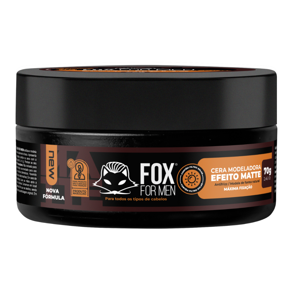 1 - CERA MATTE MODELADORA 70G - FOX FOR MEN Cera Efeito Modeladora Cabelo Seco Mate Fox For Men 70g Desperte sua criatividade e domine o estilo com a Cera Matte 70g! Projetada para os aficionados por moda capilar que desejam domar e modelar seus penteados sem comprometer a naturalidade dos fios. Com uma fixação média e acabamento fosco, esta cera proporciona o equilíbrio perfeito entre estilo e praticidade. Versátil e adaptável, pode ser aplicada em cabelos secos ou úmidos, garantindo resultados impecáveis em qualquer momento do seu dia. Ainda melhor, para uma finalização profissional, combine-a com o calor de um secador e eleve seu penteado a um novo patamar de perfeição. Sua fórmula exclusiva deixa os cabelos com um toque natural, mantendo-os no lugar com uma fixação duradoura. No entanto, é importante ressaltar que este produto não é indicado para tranças. Com a Cera Matte 70g, você está sempre no controle do seu estilo, pronto para qualquer ocasião. Apenas lembre-se de seguir as precauções: mantenha fora do alcance das crianças, evite o contato com os olhos e, se necessário, consulte um médico em caso de irritação. A liberdade de expressão está em suas mãos, liberte seu estilo com confiança!