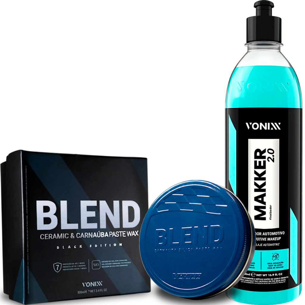 KIT CONTÉM: BLEND PASTE WAX BLACK EDITION MAKKER 2.0 500ML ------------------------------------------------------------- MAKKER 2.0 500ML - MAQUIADOR AUTOMOTIVO VONIXX 500ML DESCRIÇÃO: O Makker é um maquiador automotivo e chegou com o objetivo de trazer mais praticidade na hora de deixar o seu veículo com menos imperfeições. Sua fórmula foi desenvolvida exclusivamente para preencher pequenos defeitos e renovar pinturas, dando brilho máximo. Também contendo microabrasivos especiais, o produto é capaz de corrigir defeitos leves se utilizado com aplicador de microfibra ou máquina. Além de maquiar, o Makker deixa um toque liso e garante proteção de até 30 dias. DURABILIDADE: Até 30 dias após a aplicação MODO DE USO: 1. Agite bem o produto antes de usar 2. Aplique uma pequena quantidade do produto utilizando um aplicador de espuma ou microfibra, fazendo movimentos uniformes e circulares 3. Aguarde a secagem entre 5 a 30 minutos 4. Remova o produto utilizando uma toalha de microfibra limpa e seca até obter o brilho desejado ------------------------------------------------------------- BLEND PASTE WAX BLACK 100ML VONIXX DESCRIÇÃO: BLEND CERAMIC & CARNAÚBA PASTE WAX – BLACK EDITION é uma cera híbrida especialmente desenvolvida para carros de cor escura, principalmente os de cor preta. Composta por SiO2 e pela mais pura carnaúba tipo 1, protege a superfície veicular por até sete meses. O produto promove a resistência cerâmica, brilho quente da carnaúba e hidrorrepelência. MODO DE USO: 1- Lavar o veículo; 2- Aplicar o produto com um aplicador de espuma, fazendo movimentos uniformes; 3- Aguardar de 5 a 10 minutos; 4- Remover o produto com uma toalha de microfibra limpa e seca; 5- Para obter mais brilho e proteção, aplicar uma segunda camada.