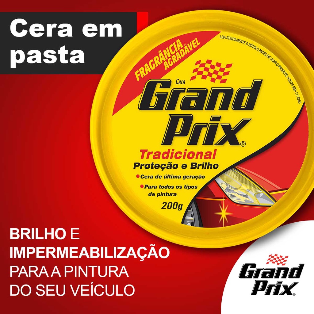 INFORMAÇÕES GERAIS: Contém: 04 Latas com 200g Modelo: 864793 DESCRIÇÃO: A Cera Automotiva GRAND PRIX foi desenvolvida com máxima tecnologia, proporcionando um poder de brilho intenso para o automóvel. Produto de fácil aplicação recomendado para todos os tipos de pinturas. Protege seu veículo dos danos causados pelo sol, chuva, poluição, sujeira, marcas de inseto além de garantir um brilho sem igual. MODO DE USAR: 1. Lave bem a superfície onde será aplicada a cera e seque-a completamente. 2. Com uma espuma aplicadora ou uma estopa de polimento, aplique a cera com camadas finas e em pequenas áreas (50 x 50cm) 3. Aguarde de 1 a 3 minutos para remover o excesso. 4. Com um pano de microfibra ou estopa de polimento, faça movimentos circulares até obter o brilho desejável. 5. Para melhores resultados, aplique a cera no veículo limpo e seco e em um local com sombra. BENEFÍCIOS: · Proporciona alto poder de brilho · Fácil aplicação e remoção · Cria excelente camada protetora · Indicado para todos os tipos de pintura