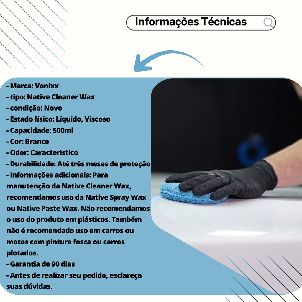 | Cera Limpadora Native Cleaner Wax 500ML Vonixx este produto | R$ 59,28 | 31% | 5.0/5 | 1 |