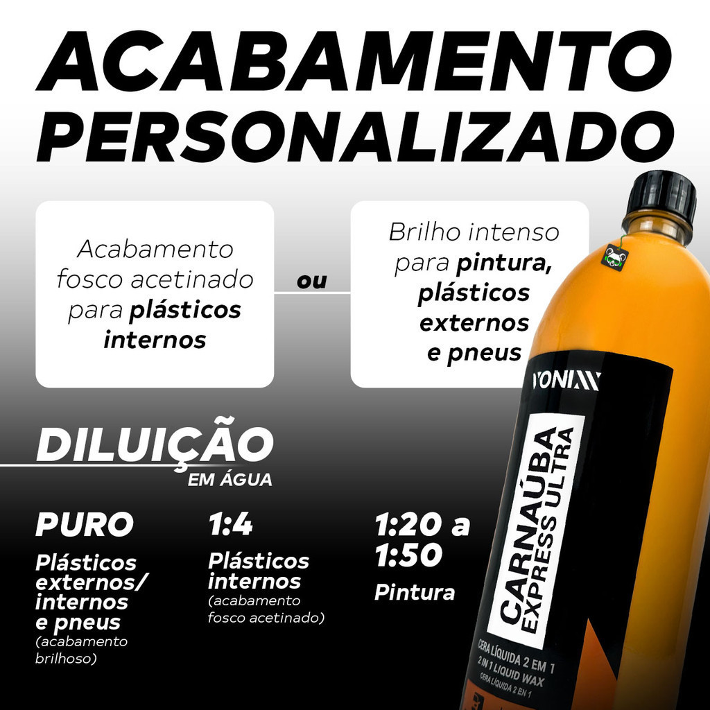 Bem-vindo a Koala Parts! A sua escolha certa para peças e acessórios automotivos - Há mais de 10 anos oferecendo qualidade e confiança. Cera Líquida Automotiva Carnaúba Express Ultra 1,5 Litros Vonixx BRILHO INTENSO, PROTEÇÃO DURADOURA E REVITALIZAÇÃO PARA TODA A SUPERFÍCIE DO SEU CARRO Produto versátil, ideal para enceramento da pintura e cuidados básicos com os plásticos. • ISENTA DE ABRASIVOS • CONTÉM CERA DE CARNAÚBA PURA • ACABAMENTO EM PLÁSTICOS E PINTURA FÓRMULA SEGURA Livre de abrasivos e segura para todos os tipos de pintura e plástico, exceto couro. ACABAMENTO PERSONALIZADO Escolha entre um acabamento fosco acetinado para plásticos internos ou um brilho intenso para pintura, plásticos externos e pneus. ALTO RENDIMENTO Até 75L de cera pronta para uso e 300 carros de pequeno porte DURABILIDADE Até 30 dias em todas as superfícies. USO RECOMENDADO Superfície Veicular Pintura Vidros Plásticos Rodas INFORMAÇÕES ADICIONAIS: DILUIÇÃO 1:4 - Plásticos internos (acabamento acetinado) 1:20 a 1:50 – Pintura Puro: Plásticos externos, plásticos internos (acabamento brilhante) e pneus. RENDIMENTO - Até 75L de cera pronta para uso. - Atende até 300 carros de pequeno porte. ESPECIFICAÇÕES TÉCNICAS: - Disponível em: 1,5L - Estado Físico: Líquido Viscoso - Cor: Laranja - Solúvel em Água - Aplicação: Enceramento rápido de pinturas automotivas, renovação e manutenção de plásticos internos e externos de veículos. CONTEÚDO DA EMBALAGEM: - 01 Cera Líquida Carnaúba Express 1,5L Vonixx
