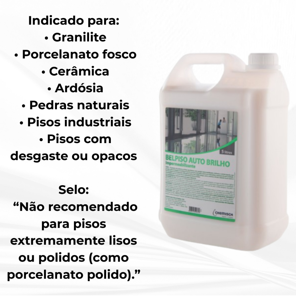 Impermeabilizante Cera Líquida Bel Piso Auto Brilho 5 Litros Profissional Você está prestes a adquirir o Impermeabilizante Bel Piso Auto Brilho, uma solução profissional de alta performance desenvolvida para quem exige excelência no tratamento de pisos. Este produto não é apenas uma cera comum; é um acabamento acrílico de alta resistência que sela, impermeabiliza e restaura o brilho de superfícies desgastadas. Sua fórmula avançada cria o efeito de "Brilho Molhado" imediato, dispensando o uso de enceradeiras industriais ou polimento manual. É a escolha número um de condomínios, empresas de limpeza, escritórios e residências que buscam renovar o ambiente com economia e praticidade. PRINCIPAIS BENEFÍCIOS E DIFERENCIAIS 1. Tecnologia Auto Brilho (Dispensa Enceradeira) Ao secar, o produto forma um filme acrílico brilhante e uniforme. O brilho é ativado quimicamente durante a secagem, eliminando a necessidade de máquinas de polir. O resultado é um acabamento espelhado instantâneo. 2. Impermeabilização e Proteção O Bel Piso penetra nos micro poros da superfície, criando uma barreira protetora contra a absorção de água, óleos, gorduras e sujeiras do dia a dia. Isso facilita drasticamente a limpeza diária e evita manchas permanentes no piso. 3. Resistência ao Tráfego Desenvolvido para suportar o alto tráfego de pessoas. A película protetora evita riscos superficiais, desgastes prematuros e marcas de sapatos (scuff marks), prolongando a vida útil do revestimento. 4. Segurança Antiderrapante Apesar do acabamento intensamente brilhante, a formulação possui agentes que aumentam o coeficiente de atrito, garantindo que o piso não fique escorregadio, proporcionando segurança para crianças, idosos e ambientes comerciais. 5. Recuperação de Pisos Desgastados Ideal para superfícies que perderam a cor ou estão com aspecto fosco e poroso. O produto devolve a vivacidade e o aspecto de novo. SUPERFÍCIES RECOMENDADAS O Impermeabilizante Bel Piso é extremamente versátil e indicado para uma ampla gama de pisos laváveis e porosos, tais como: Paviflex e Pisos Vinílicos: Restaura o brilho original e protege contra riscos. Ardósia e Pedras Naturais: Realça a cor natural da pedra e impede a absorção de líquidos. Cimento Queimado e Concreto: Sela a porosidade e elimina a poeira natural do concreto. Granilite e Marmorite: Devolve o brilho de pedra polida. Cerâmicas (Não Esmaltadas) e Lajotas: Protege e embeleza. Madeira (Com verniz ou selador): Pode ser usado para manutenção de brilho em pisos de madeira já tratados (tacos e parquets), desde que estejam íntegros. Atenção: Em porcelanatos polidos ou cerâmicas vitrificadas (lisas e brilhantes), recomenda-se um teste prévio em uma pequena área, pois a ancoragem do produto depende da porosidade da superfície. MANUAL DE APLICAÇÃO PASSO A PASSO (TÉCNICO) Para garantir o resultado profissional, siga rigorosamente as etapas abaixo: Fase 1: Preparação da Superfície (Fundamental) O piso deve estar totalmente isento de ceras antigas, seladores, poeira, gordura ou umidade. Utilize um removedor de ceras (caso haja cera velha) ou um detergente neutro para lavar o piso. Enxágue bem para remover qualquer resíduo químico. Aguarde a secagem total do piso. A umidade pode deixar o acabamento turvo ou esbranquiçado. Fase 2: Aplicação Aplique o Bel Piso Auto Brilho puro (sem diluir). Utilize um aplicador de cera (mop), rodo com espuma ou pano de chão limpo e seco (que não solte fiapos). Espalhe o produto em camadas finas e uniformes, sempre no mesmo sentido. Não deixe poças de produto. Aguarde o tempo de secagem entre demãos (de 30 a 45 minutos, dependendo da ventilação do local). O piso deve estar seco ao toque antes da próxima camada. Fase 3: Acabamento Recomenda-se a aplicação de 2 a 3 demãos para obter o máximo de brilho e proteção. Para pisos muito porosos (como cimento ou ardósia crua), pode ser necessária uma demão extra para selar completamente os poros. Fase 4: Manutenção Diária Para limpar o piso tratado, utilize apenas detergente neutro diluído em água e pano úmido. Evite produtos à base de cloro, álcool puro ou solventes fortes, pois eles removem o brilho da cera. DADOS TÉCNICOS E RENDIMENTO Volume da Embalagem: 5 Litros. Rendimento Estimado: 60m² a 80m² por litro, por demão. (Um galão de 5 litros pode cobrir até 350m² com uma única demão, variando conforme a porosidade do piso). Aspecto: Líquido leitoso (torna-se incolor e brilhante após a secagem). Odor: Característico, suave e agradável. PERGUNTAS FREQUENTES (FAQ) Preciso usar enceradeira para dar brilho? Não. O produto possui tecnologia Auto Brilho. O brilho surge naturalmente assim que o produto seca. O uso de enceradeira é opcional (apenas se desejar polimento térmico, mas não é necessário). O produto deixa o piso escorregadio? Não. O Bel Piso é formulado para oferecer aderência segura para o tráfego de pessoas, desde que aplicado corretamente sobre a superfície limpa e seca. Posso aplicar em piso de madeira?