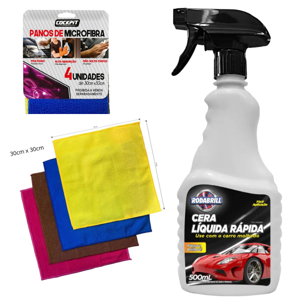 Cera Líquida BRILHO IMEDIATO c/ CARRO MOLHADO 500ML Rodabrill + Opção c/4 Panos Microfibra (ESCOLHA)